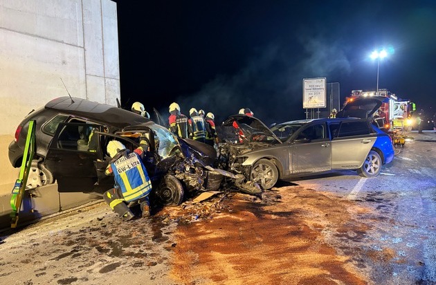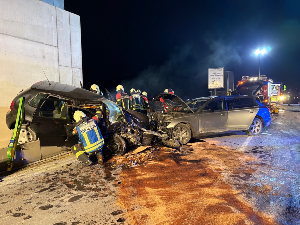 Vor Ort konnten die Einsatzkräfte zwei frontal kollidierte PKWs antreffen. Glücklicherweise brannte keines der Fahrzeuge. In einem Unfallfahrzeug wurde eine Person eingeschlossen. Die beiden Insassen des zweiten Fahrzeugs konnten sich selbst aus ihrem Fahrzeug befreien.