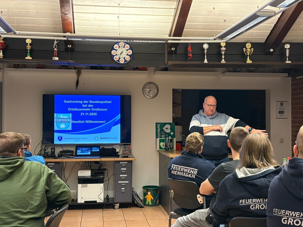 Am 21.11.2025 versammelten sich die Ortsfeuerwehr Großmoor sowie Vertreterinnen und Vertreter der Feuerwehren Adelheidsdorf, Nienhagen und Wathlingen zu einer besonderen Fortbildungsveranstaltung im Gerätehaus Großmoor. Im Mittelpunkt stand das sichere Arbeiten an und in Gleisanlagen - ein Thema, das für die Einsatzkräfte der Samtgemeinde von großer Bedeutung ist, da Bahnanlagen das tägliche Bild prägen und immer wieder Schauplatz anspruchsvoller Einsätze sind. Um die Sicherheit der Kameradinnen und Kameraden im Gleisbereich weiter zu erhöhen, konnte mit Stefan Wolff ein erfahrener Bundespolizist als Referent gewonnen werden. Vor rund 30 Feuerwehrleuten hielt Stefan Wolff einen spannenden und praxisnahen Vortrag, der durch eindrucksvolle Erlebnisse aus dem Einsatzalltag bereichert wurde. Die Teilnehmenden erhielten wertvolle Einblicke in den Aufbau von Gleisanlagen, das richtige Verhalten bei Unfällen, die Gefahren von Oberleitungen sowie die einzuhaltenden Sicherheitsabstände. Darüber hinaus wurden aktuelle Informationen zum ETCS-System (European Train Control System) und zur korrekten Interpretation von Bahnkilometern zur schnellen Lokalisierung von Einsatzstellen vermittelt. Besonders hervorzuheben ist der intensive Austausch nach dem Vortrag: Die Einsatzkräfte nutzten die Gelegenheit, um Erfahrungen zu teilen und voneinander zu lernen. Dieser Dialog ist von unschätzbarem Wert, denn im Ernstfall zählt das reibungslose Zusammenspiel aller Beteiligten. Die Veranstaltung unterstreicht eindrucksvoll das Engagement der Feuerwehren in der Samtgemeinde, sich kontinuierlich fortzubilden und gemeinsam für mehr Sicherheit im Einsatz zu sorgen. Dank des fundierten Fachwissens von Stefan Wolff und der regen Beteiligung aller Anwesenden konnten die Feuerwehrleute zahlreiche wichtige Erkenntnisse mit nach Hause nehmen - ein Gewinn für jede einzelne Einsatzkraft und die gesamte Samtgemeinde.
