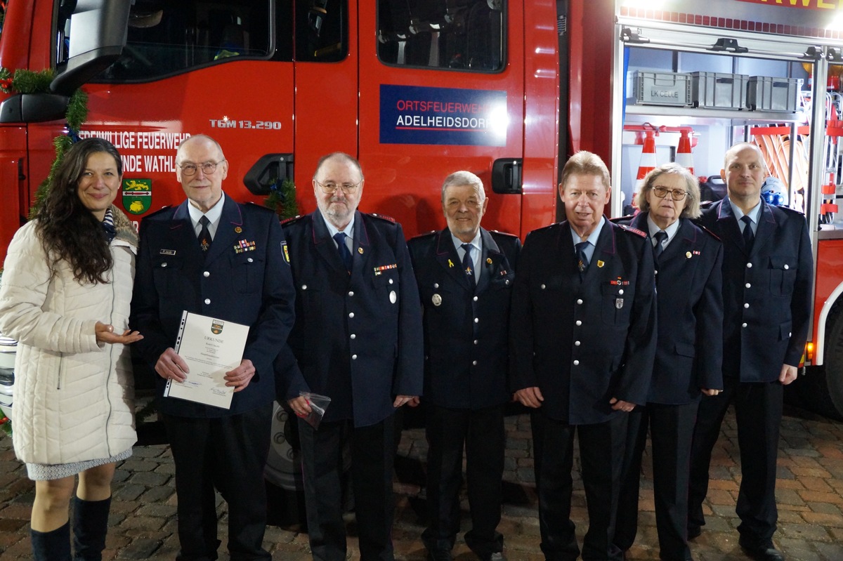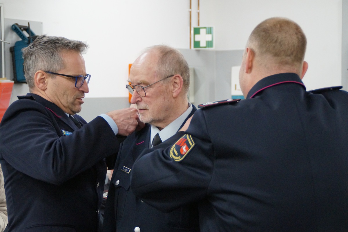 Im Anschluss an die offizielle Übergabe folgte ein weiterer Grund zur Freude: Die Alters- und Ehrenabteilung der Ortsfeuerwehr Adelheidsdorf konnte die nach neuer Feuerwehrverordnung geänderten Dienstgrade in Empfang nehmen. Die ehemaligen Kameradinnen und Kameraden gehören damit zu den Ersten im Landkreis Celle.