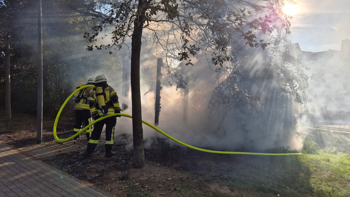 Unklares Feuer in Park, hohe Flammen, mit diesem Einsatzstichwort wurden die Feuerwehren Hermannsburg, Baven, der Rettungsdienst und die Polizei am frühen Donnerstagabend in die Lotharstraße alarmiert. Eine große, schwarze Rauchwolke war schon kilometerweit zu sehen. Im Örtzepark, nahe der Sparkasse brannte ein Holzunterstand und ein dort abgestelltes Dixi. Beides war vor Eintreffen der Feuerwehr fast vollkommen abgebrannt und zerstört. Zwei Trupps unter Umluft unabhängigem Atemschutz löschte die Überreste ab und kühlte einen ebenfalls betroffenen Baum und angrenzende Sträucher. Abschließend wurde die Brandstelle mit der Wärmebildkamera kontrolliert. Die Polizei hat die Ermittlungen aufgenommen. Nach rund 30min war der Einsatz beendet.