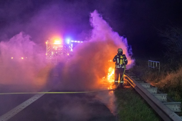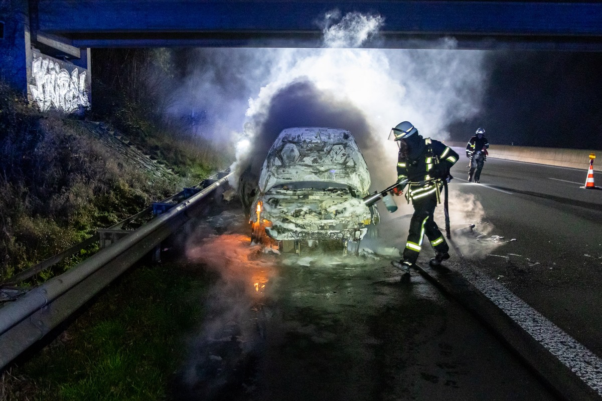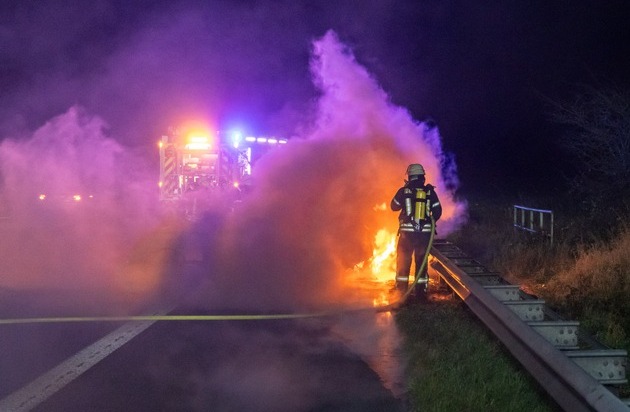 Porta Westfalica A2. Die Freiwillige Feuerwehr Porta Westfalica wurde am Dienstag, 23.12.2025, gegen 00:53 Uhr zu einem PKW-Brand auf der A2 alarmiert. Bei Eintreffen stand das Fahrzeug in Vollbrand, die Insassen - 2 Erwachsene und ein Kind - hatten das Fahrzeug aus eigener Kraft verlassen können und waren unverletzt.
