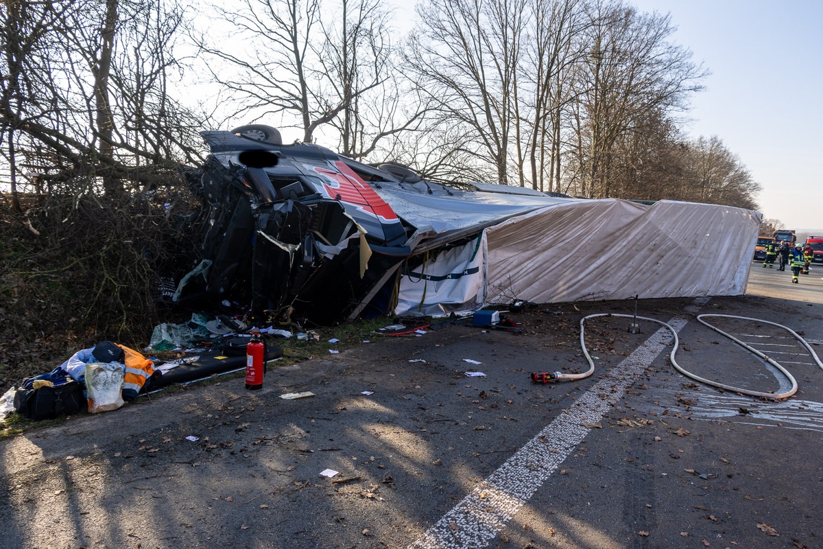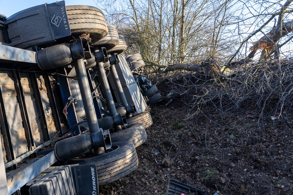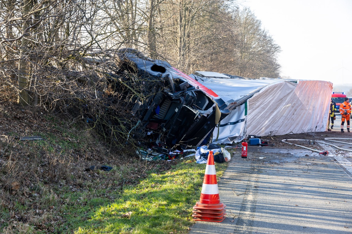 Die Unfallstelle lag auf der A2 in Fahrtrichtung Hannover in Höhe der Eisberger Mühle. Verunfallt war ein Sattelzug beladen mit Torf-/Blumenerde jeweils in 25kg-Säcken auf Paletten. Der LKW war in die Böschung gefahren und in die Bäume oberhalb eingeschlagen. Der Sattelzug stürzte daraufhin um und blieb auf der Seite im Bereich des Standstreifens liegen. Der Fahrer wurde bei dem Unfall verletzt, konnte das Führerhaus aber mit Hilfe von Ersthelfern verlassen. Er wurde rettungsdienstlich und notärztlich versorgt und ins Klinikum Minden transportiert. Bei dem Unfall wurde der Dieseltank aufgerissen, erhebliche Mengen an Betriebsmitteln liefen im Bereich der Böschung aus. Die Feuerwehr sicherte die Einsatzstelle bei Eintreffen ab und nahm einen Löschangriff vor. Der Verkehr wurde auf einer Spur an der Unfallstelle vorbeigeführt, es kam zu einem erheblichen Rückstau. ein Großteil der anrückenden Kräfte konnte den Einsatz auf der Anfahrt abbrechen, die Löschgruppe Veltheim-Möllbergen verblieb bis zum Eintreffen der Unteren Wasserbehörde an der Einsatzstelle. Die Einsatzstelle wurde an Polizei und Havariekommissar übergeben, die Untere Wasserbehörde des Kreises veranlasste Maßnahmen zur Bereinigung des Ölschadens. Die Bergung erfolgt durch ein Fachunternehmen, dies wird wahrscheinlich einige Stunden dauern.