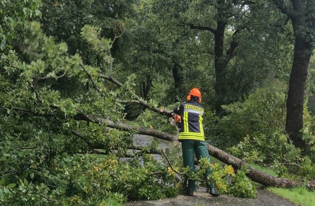 Die Straße Achtert Kipp im Ortsteil Wiesens wurde am Samstagvormittag durch einen umgestürzten Baum blockiert. Zudem hingen Teile des Geästs in einer angrenzenden Telefonleitung fest. Um 10:18 Uhr ist die Feuerwehr Wiesens zur Beseitigung des Sturmschadens alarmiert worden. Nachdem die Einsatzkräfte für eine Absicherung der Fahrbahn gesorgt hatten, nahmen sie eine Kettensäge vor und zerteilten den Stamm. Schnell konnte die betroffene Telefonleitung dadurch von der Last des Baumes befreit werden, sodass keine Beschädigungen an dieser entstanden. Anschließend wurden die verbleibenden Teile des Gehölzes zerlegt und die Straße wieder freigeräumt. Gut eine halbe Stunde dauerte der Einsatz der Feuerwehr vor Ort an.