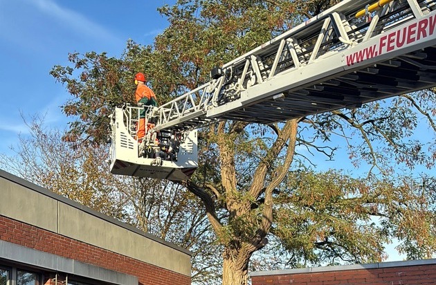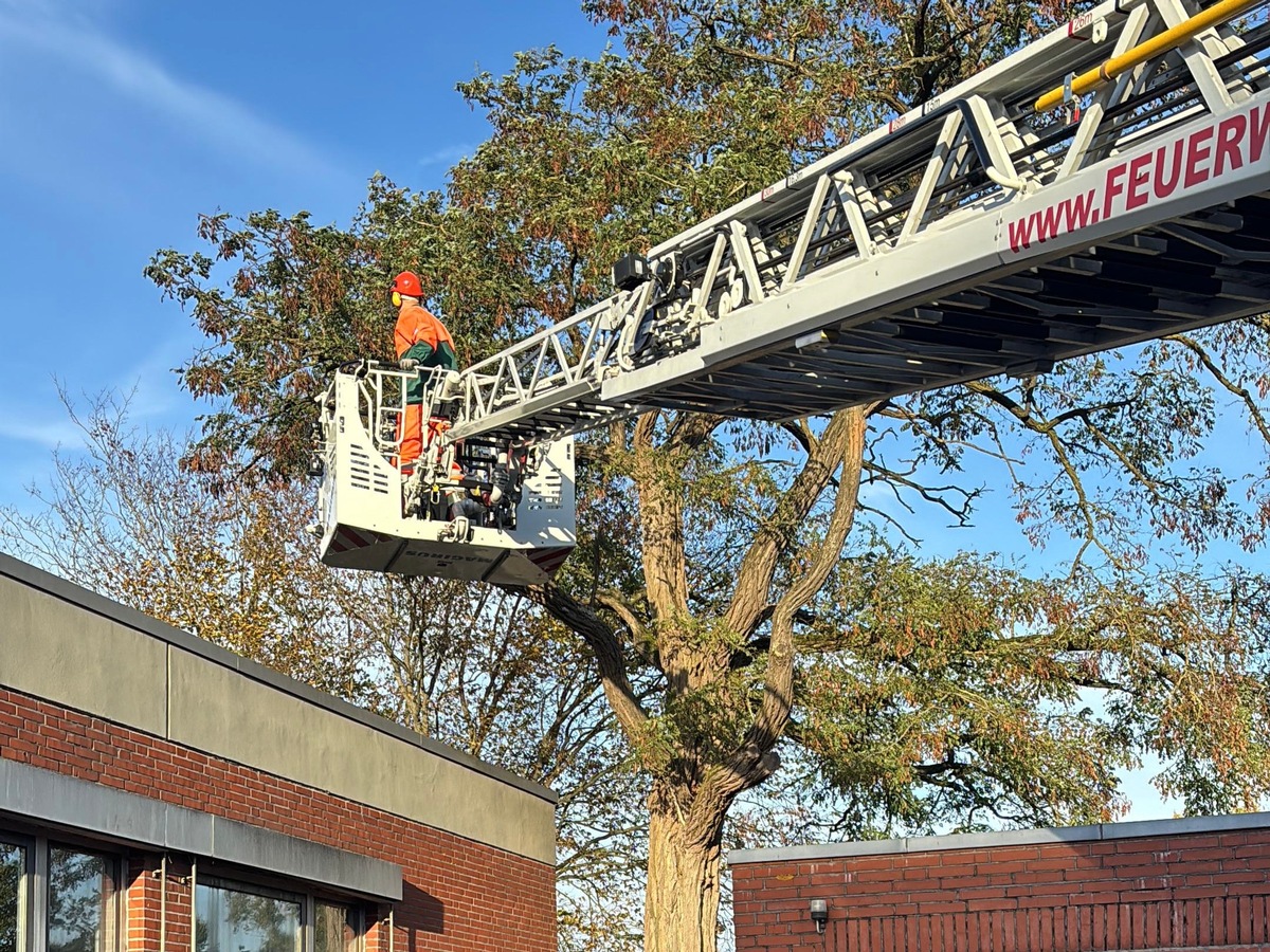 Am Nachmittag musste dann die Feuerwehr Aurich mit der Drehleiter tätig werden. Auf dem Gelände des Krankenhauses an der Wallinghausener Straße drohten Baumteile auf einen Gebäudetrakt zu stürzen. Unter Vornahme einer Kettensäge wurde das betroffene Geäst zielgerichtet vom Korb der Drehleiter aus zurückgeschnitten. Die Umsturzgefahr des Baumes konnte hierdurch erfolgreich gebannt werden.