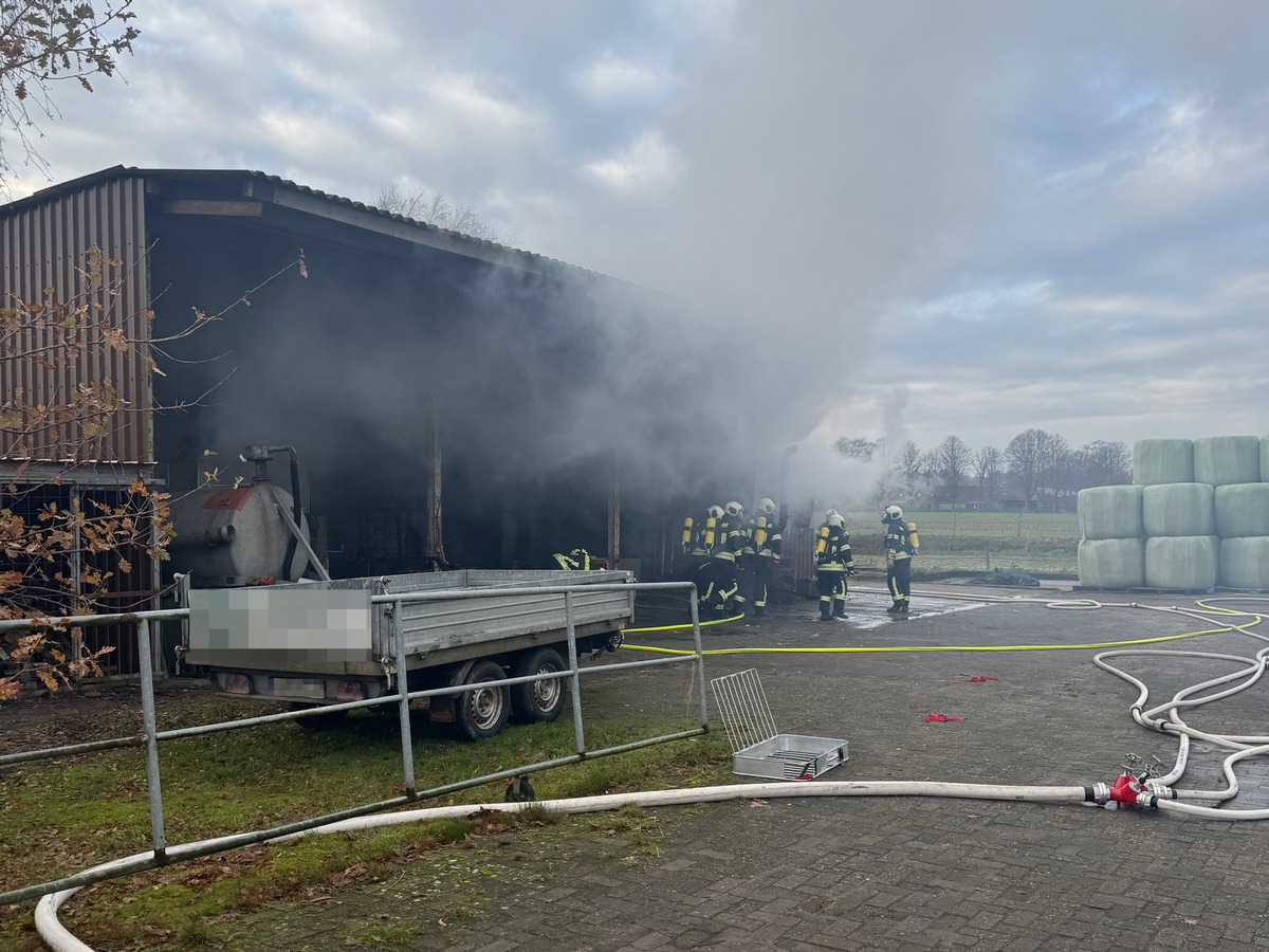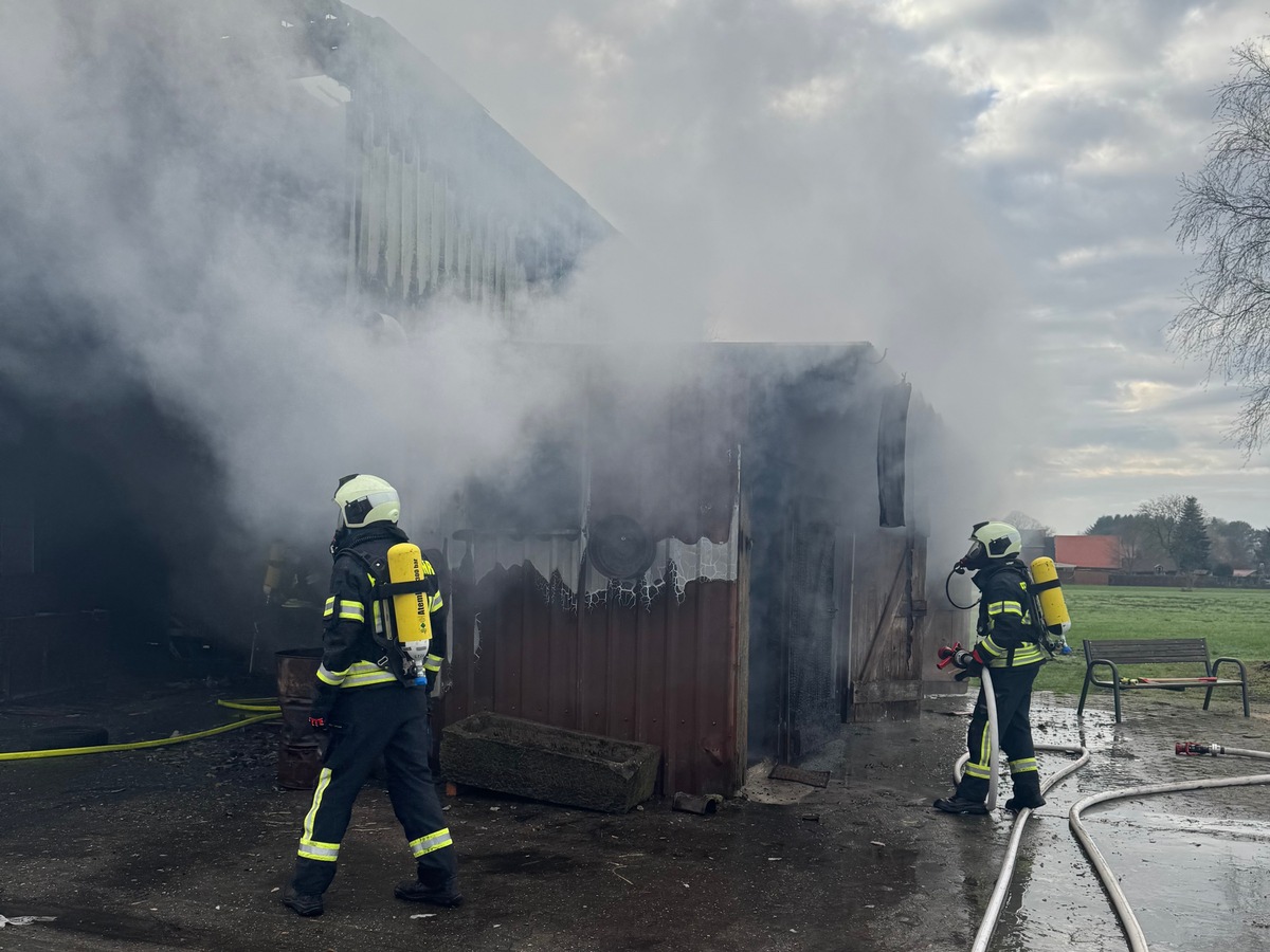 Mittwochmittag geriet ein Schuppen im Winkelweg in Brand. Es handelte sich um einen etwa sechs mal drei Meter großen Holzanbau eines Unterstandes für Landmaschinen, dessen Innenraum beim Eintreffen der gegen 12:40 Uhr alarmierten Feuerwehren Wallinghausen und Plaggenburg bereits in Flammen stand. Ebenfalls rückte der Einsatzleitwagen der Feuerwehr Aurich an. Atemschutzgeräteträger begannen umgehend mit den Löscharbeiten. Zugleich wurde eine unabhängige Wasserversorgung zum nächstgelegenen Hydranten errichtet. Menschen oder Tiere waren auf dem landwirtschaftlichen Anwesen nicht gefährdet.