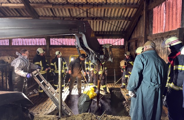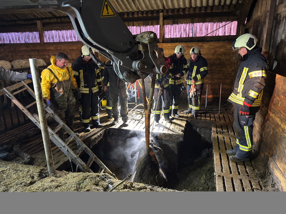 Die Situation vor Ort erwies sich eingangs zeitkritisch, da eines der Tiere bereits zum Großteil in der angestauten Gülle des gut 2,20 Meter tiefen Kellers versunken war. Den anwesenden Landwirten und Feuerwehrleuten gelang es, den Kopf der Kuh mit einer Leine zu versehen und sie so über der Oberfläche zu halten. Das zweite Tier war offenbar hinterhergestürzt und lag zum Großteil auf dem schon weithin versunkenen Rind, sodass die Einsatzkräfte gut an den Körper herangelangen und entsprechende Haltegurte befestigen konnten. Parallel nahm ein Pumpfahrzeug einiges an Inhalt aus dem Güllekeller auf, sodass der Pegelstand abgesenkt worden ist. Mit einem auf dem Hof vorhandenen Teleskopfahrzeug wurde das erste der beiden Lebewesen rund 30 Minuten nach Eintreffen aus der Grube gehoben.