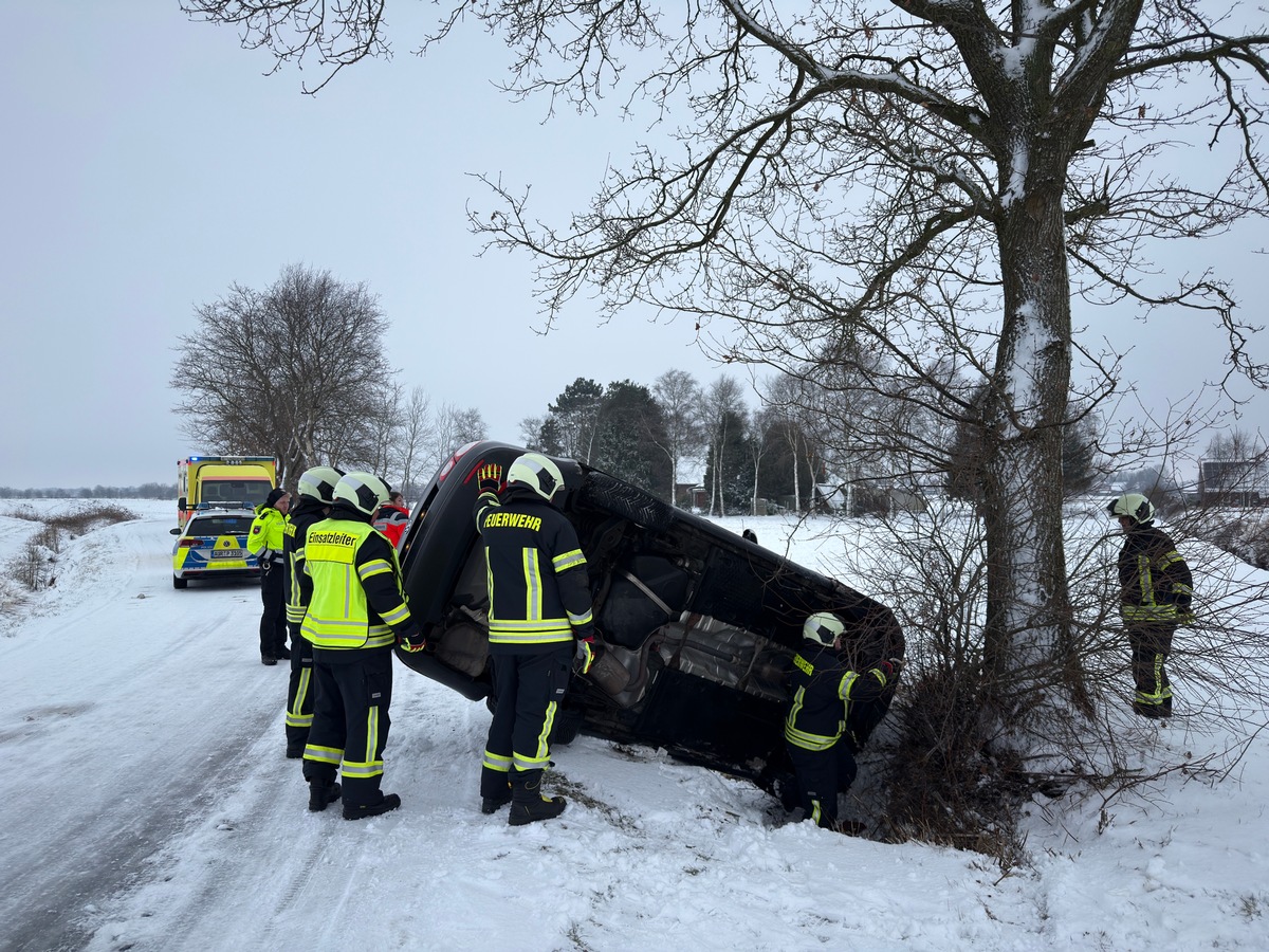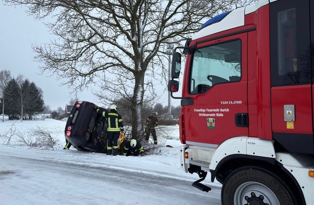 Auf eisglatter Fahrbahn ist ein PKW am Montagvormittag von der Straße Im Extumer Moor abgekommen und seitlich in einem Graben gelandet. Weil das Auto auf der Fahrerseite zum Liegen kam, ist der Fahrzeugführer in dem Wagen eingeschlossen worden. Der ersteintreffende Rettungsdienst forderte daraufhin die Unterstützung der Feuerwehr Walle an. Nach kurzer Inaugensscheinnahme der Begebenheiten vor Ort entschieden sich die Einsatzkräfte dazu, den PKW vorsichtig wieder aufzurichten. Im Anschluss konnte dem Mann aus dem Wagen verholfen und dieser an den Rettungsdienst übergeben werden, der ihn zur weiteren Versorgung ins Krankenhaus transportierte. Ein Abschleppunternehmen übernahm die Bergung des Autos, für die Feuerwehr Walle war der Einsatz nach etwa 30 Minuten beenden.