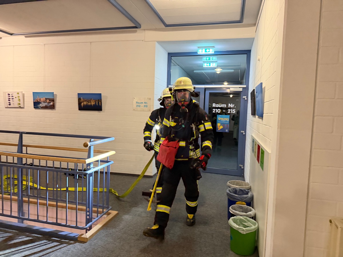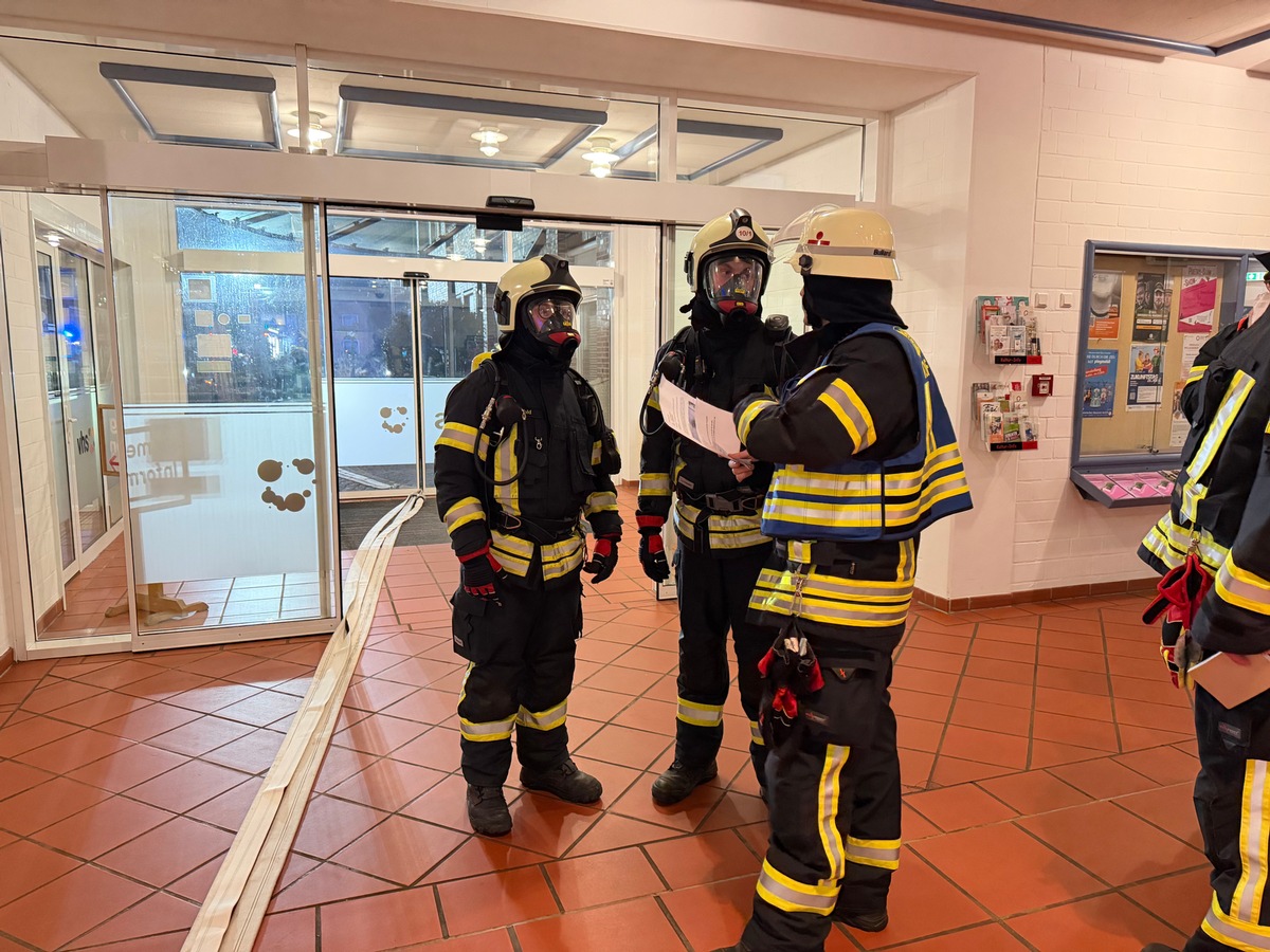 Vorrückende Atemschutztrupps hatten zuallererst den Auftrag, die weitläufigen Korridore der Obergeschosse umfangreich abzusuchen und die Menschenrettung durchzuführen. Neben einigen Statisten waren auch Übungspuppen an verschiedenen Stellen positioniert worden, die es teilweise unter Nullsicht zu finden und retten galt. Im Außenbereich musste die Einsatzstelle derweil koordiniert errichtet werden, um den vorhandenen Platz gezielt mit den erforderlichen Fahrzeugen zu besetzen. Vor der Gebäudefront wurde die Drehleiter in Stellung gebracht, über deren Rettungskorb im Übungsverlauf mehrere Personen in Sicherheit gebracht worden sind. Weitere Kräfte waren mit dem Aufbau einer Wasserversorgung betraut, wozu Schlauchleitungen über mehrere hundert Meter entlang der Oldersumer Straße verlegt werden mussten.