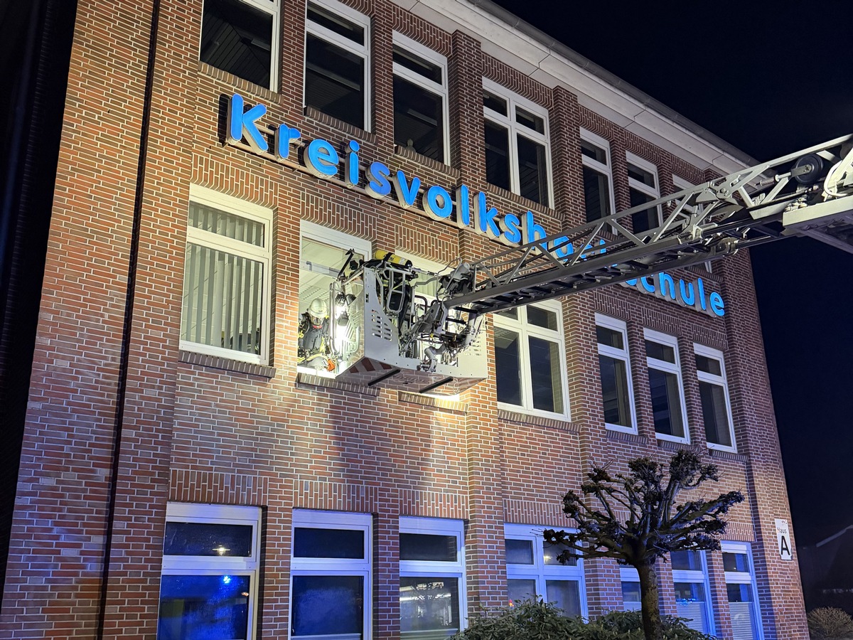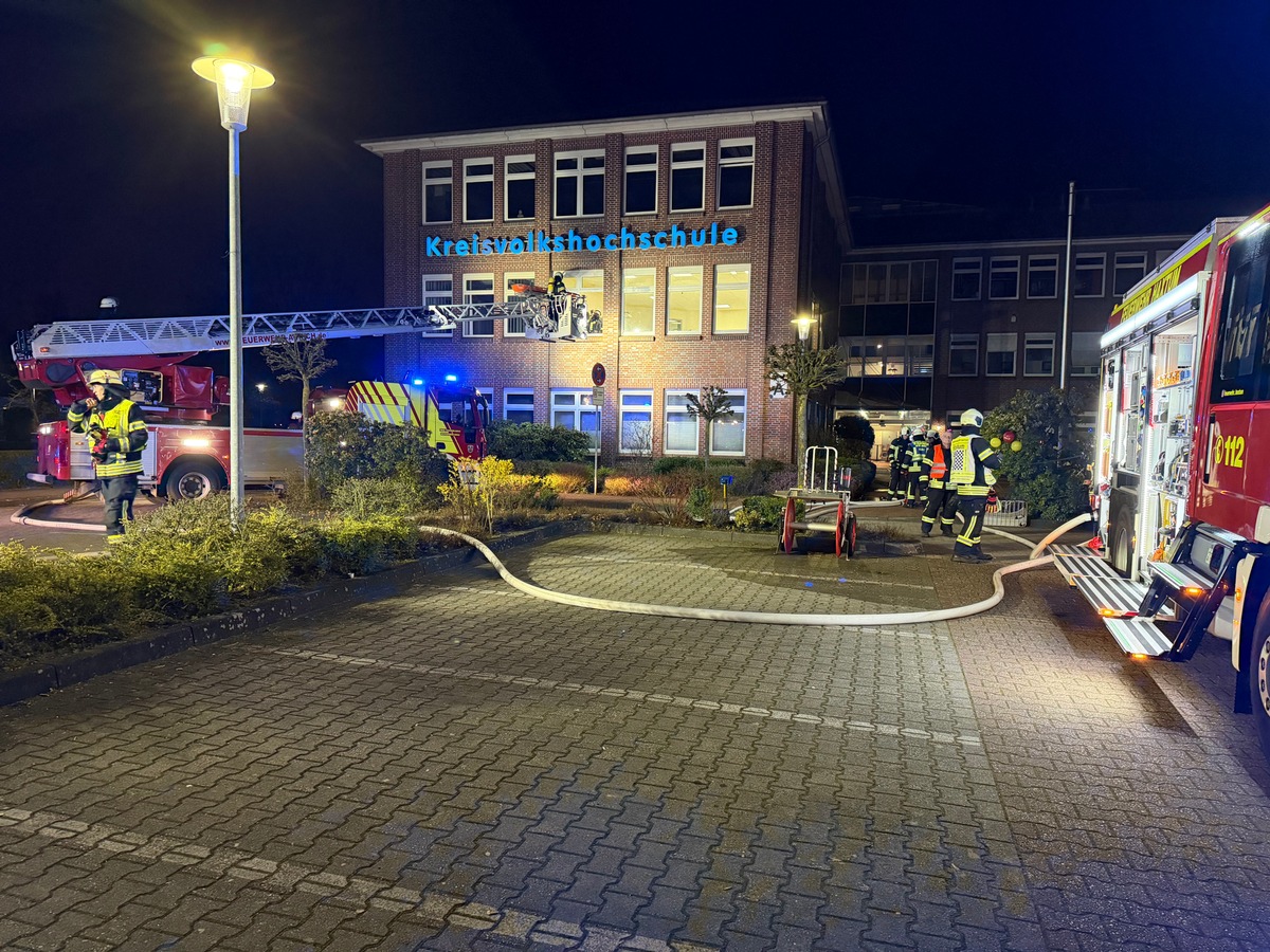 Auf dem Gelände der Kreisvolkshochschule haben die Feuerwehren Haxtum und Aurich am Montagabend eine gemeinsame Einsatzübung durchgeführt. Die mehrköpfige Übungsleitung hatte sich hierfür ein anspruchsvolles Szenario einfallen lassen, welches die rund 45 involvierten Feuerwehrkräfte im Verlauf des Abends vor einige Herausforderungen stellen sollte. Simuliert wurde ein Brand in einem Schulungsraum des Gebäudekomplexes, durch den es zu einer erheblichen Rauchentwicklung innerhalb des Haupthauses gekommen sein sollte. Mehrere Personen galten als vermisst, zudem breitete sich das Feuer im zweiten Obergeschoss rasch aus und ergriff durch Funkenflug auch einen rückwärtigen Schuppentrakt.