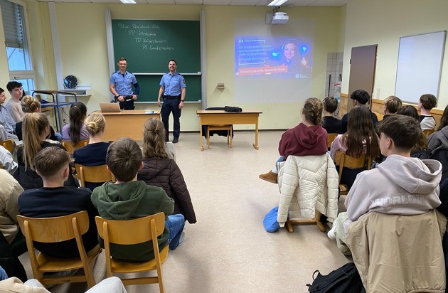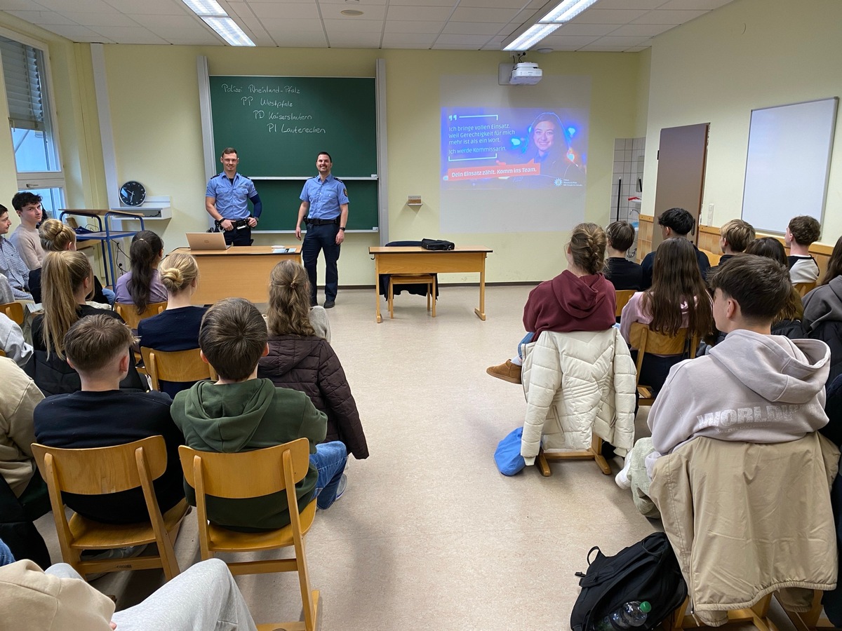 Im Rahmen der Berufsorientierungswoche am Paul-Schneider-Gymnasium in Meisenheim informierte die Polizei Lauterecken in mehreren Vorträgen über den Polizeiberuf. Insgesamt nahmen 45 Schülerinnen und Schüler der elften Klassenstufe an der Vortragsreihe teil. Neben einer Vorstellung des Berufsbildes wurden die Einstellungsvoraussetzungen sowie der Ablauf des Wissens- und Sporttests erläutert. Hierbei zeigte sich bei vielen Teilnehmern ein reges Interesse am Polizeiberuf.