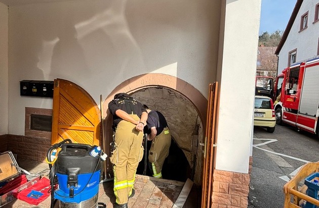 Bis zum Eintreffen der Feuerwehr standen in einem kleinen Keller rund zehn Zentimeter hoch Wasser. Nach ersten Erkenntnissen drang das Wasser von außen durch die Kellerwand ein.