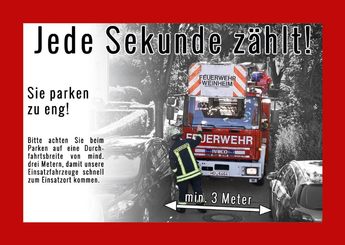 Die Anfahrt gestaltete sich schwierig. Die Straße (Birkenweg) war so dicht zugeparkt, dass die notwendige Durchfahrtsbreite nicht gegeben war. Das Hilfeleistungslöschfahrzeug musste zurücksetzen und eine alternative Strecke nutzen. Die Polizei Weinheim wurde daher nachgefordert, um den Sachverhalt aufzunehmen. Der Vorfall zeigt ein flächendeckendes Problem in Stadtgebiet. Enge und zugeparkte Straßen verzögern immer wieder Hilfe. Rettungsfahrzeuge sind regelmäßig auf freie Zufahrten angewiesen. Daher appelliert die Feuerwehr an alle, rücksichtsvoll und vorausschauend zu Parken.