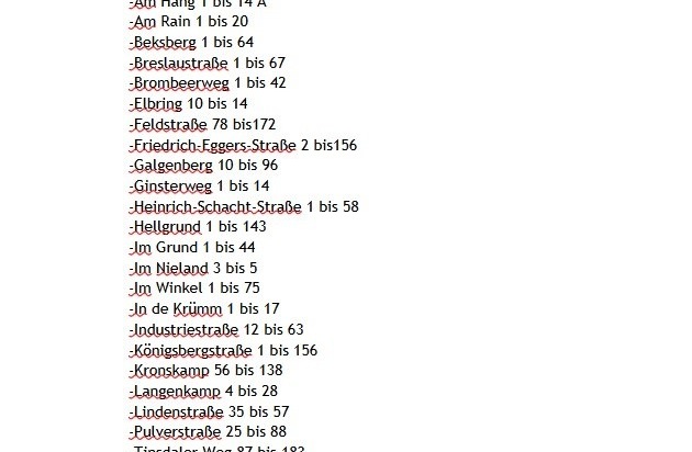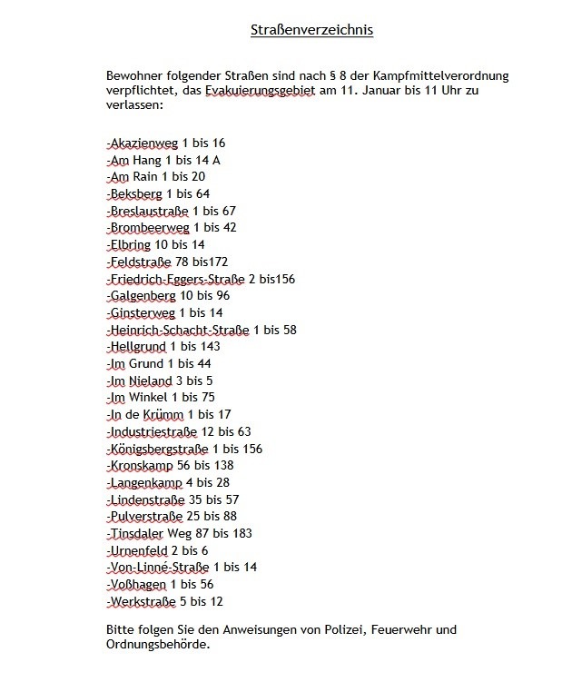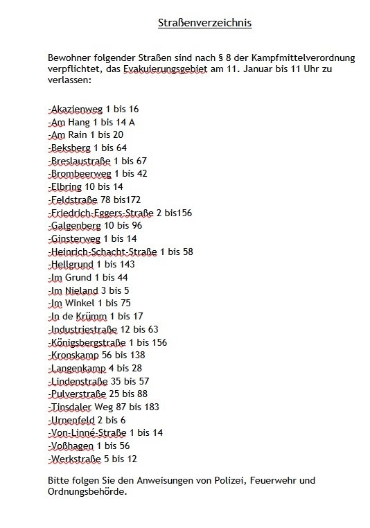 Der Pressemitteilung sind ein Straßenverzeichnis und eine Karte des festgelegten Evakuierungsgebietes beigefügt.