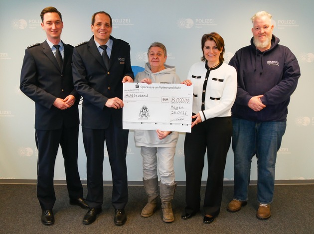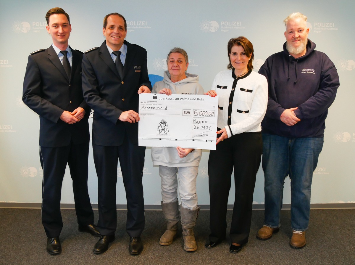 Am 19.12.2025 veranstaltete der gemeinnützige Verein der Freunde der Polizei Hagen (FUKS e.V.)in enger Zusammenarbeit mit dem Polizeipräsidium Hagen und unter der Schirmherrschaft von Polizeipräsidentin Ursula Tomahogh ein Benefizkonzert in der Johanniskirche. Wie bereits in den Jahren 2023 und 2024 stimmten die Berufsmusiker der Jazz-Rock-Pop-Band des Landespolizeiorchesters NRW die rund 400 Besucherinnen und Besucher auf das bevorstehende Weihnachtsfest ein. Gemeinsam mit zwei Sängerinnen, einem Sänger sowie einem Kinder- und Jugendchor gelang es, eine stimmungsvolle und emotionale Atmosphäre zu schaffen. Insgesamt kamen Spenden in Höhe von 8.000 Euro für den Verein Unsichtbar e.V., der sich unter anderem für obdachlose Menschen im Stadtgebiet einsetzt, zusammen. Am Montag (26.01.2026) überreichte der Vorsitzende des Vereins FUKS e.V., Tino Schäfer, zusammen mit Polizeipräsidentin Ursula Tomahogh und Vereinsmitglied Tim Sendler einen symbolischen Spendenscheck. Die Vorstandsmitglieder des Vereins Unsichtbar e.V., Herr Holger Brandenburg und Frau Beate Wachsmann, nahmen den Scheck entgegen und sprachen ihren ausdrücklichen Dank an alle Spenderinnen und Spender aus. (sen)