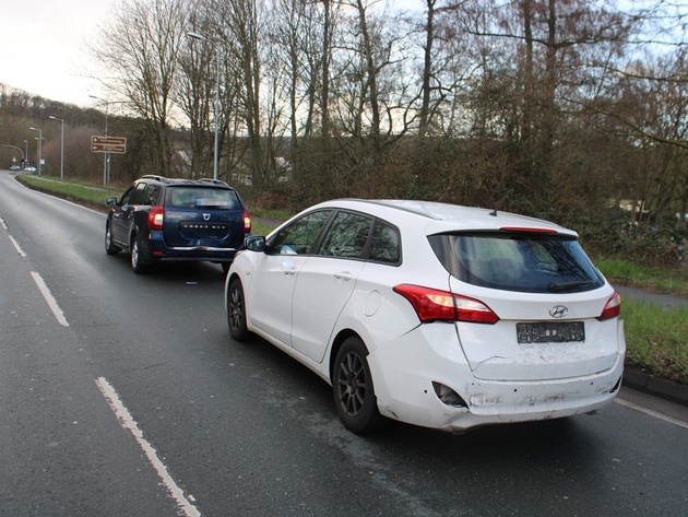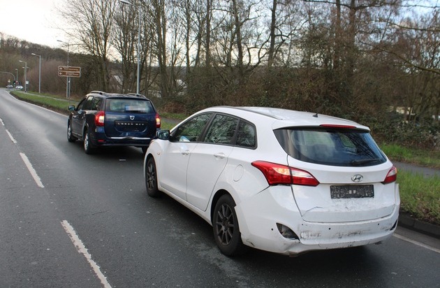 Der Unfall ereignete sich gegen 16.20 Uhr, als der 20-Jährige mit seinem Citroen Jumper auf der Herdecker Straße in Richtung Herdecke unterwegs war und an einer Ampel einem Hyundai i30 auffuhr. Dessen 40 Jahre alter Fahrer hatte seine Fahrt nach verkehrsbedingtem Halten fortgesetzt und wurde durch den Zusammenstoß mit dem Transporter gegen einen Dacia Logan geschoben. Alle Autos wurden leicht beschädigt. Zudem erlitt der 40-jährige Hyundai-Fahrer leichte Verletzungen, die von Rettungskräften behandelt wurden.