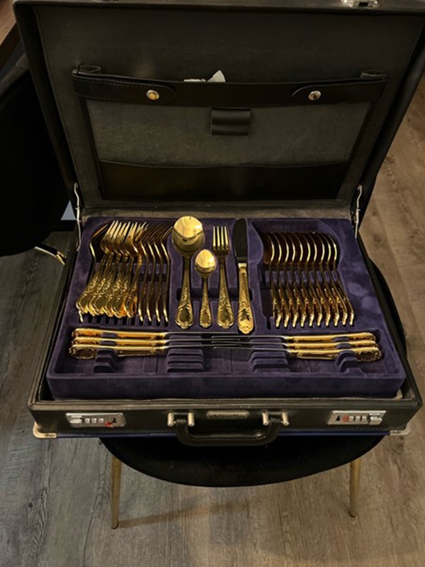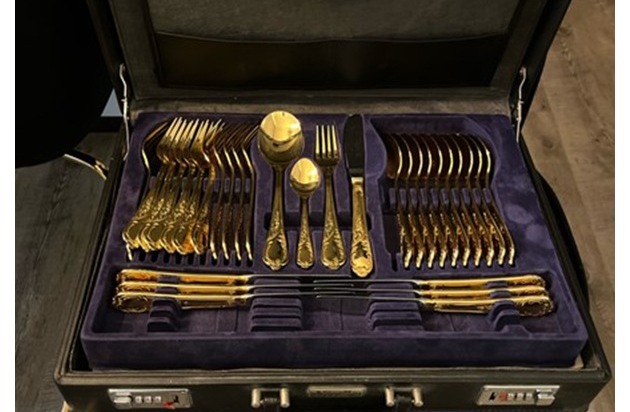 Bei einer Durchsuchung in Ibbenbüren wurde ein Besteckkoffer mit einem fast vollständigen Satz goldenen Bestecks sichergestellt. Die Ermittler konnten den Koffer bislang keinem Geschädigten zuordnen.