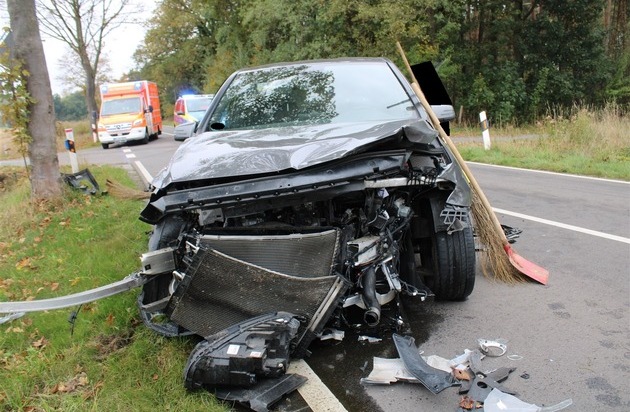 Die 34-Jährige und ihr 40-jähriger Beifahrer erlitten leichte Verletzungen. Beide wurden durch eine Rettungswagenbesatzung vor Ort erstversorgt und anschließend in das Krankenhaus Lübbecke transportiert. Der Mercedes-Fahrer und sein Mitfahrer blieben körperlich offenbar unversehrt. Die beiden Fahrzeuge wurden stark beschädigt und mussten abgeschleppt werden. Durch den Unfall wurden zudem ein Baum sowie ein Zaun in Mitleidenschaft gezogen.