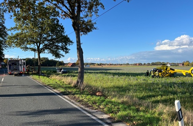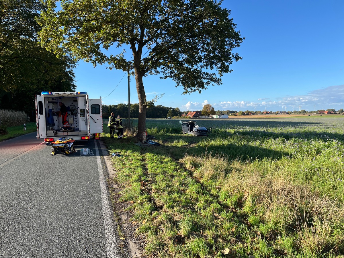 Am 23.10.2025, gegen 14:40 Uhr, befuhr ein 58-jähriger PKW Fahrer die Brockumer Straße in Fahrtrichtung Niedersachen. Aus bisher ungeklärte Ursache kam das Fahrzeug nach rechts von der Fahrbahn ab, prallte gegen einen Baum und wurde auf das angrenzende Feld geschleudert. Der Fahrer wurde in dem stark beschädigten Opel eingeklemmt,von der Feuerwehr befreit und notärztlich versorgt. Der Fahrzeugführer wurde mit lebensgefährlichen Verletzungen mittels Rettungshubschrauber in ein umliegendes Krankenhaus geflogen. Es befanden sich keine weiteren Personen im PKW. Ein Verkehrsunfallaufnahmeteam aus Bielefeld wurde angefordert. Die Unfallstelle ist zur Zeit noch voll gesperrt.