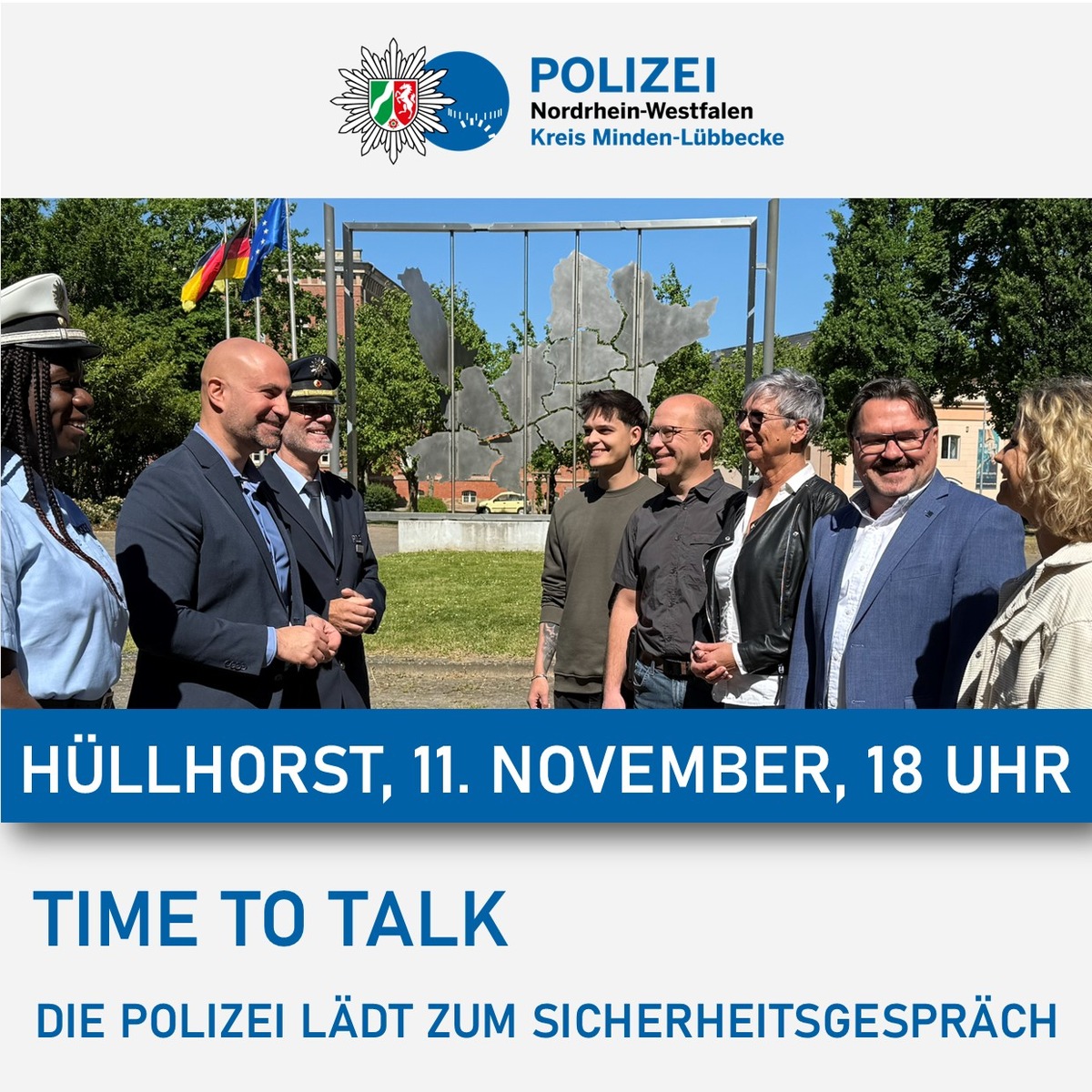 (TB) "Time to Talk", unter diesem Slogan veranstaltet die Kreispolizeibehörde des Mühlenkreises zum dritten Mal einen Bürgerdialog. Gastgeber der Veranstaltung am Dienstag, den 11. November 2025 ist die Gemeinde Hüllhorst. Landrat Ali Dogan, Bürgermeister Michael Kasche sowie Polizeidirektorin Andrea Rosenboom laden um 18:00 Uhr in die Ilex-Halle ein. Anmeldungen sind nicht erforderlich.