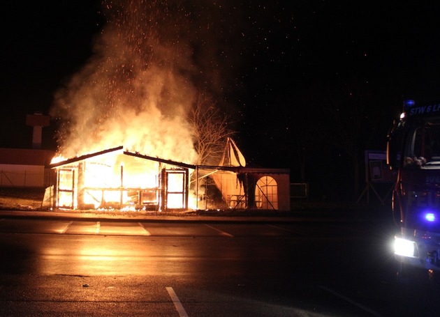 So wurde die Polizei gegen 3.45 Uhr von einem Zeugen zu dem am Parkplatz eines Verbrauchermarktes in Flammen stehenden Imbiss hingewiesen. Kräften der Feuerwehr gelang es, die in Vollbrand stehende Hütte zu löschen. Verletzt wurde niemand.