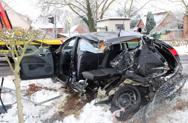 Der leichtverletzte Fahrer konnte sich selbstständig aus dem Autowrack befreien und flüchtete anschließend zu Fuß. Der Flüchtige konnte im Rahmen einer Fahndung aufgespürt und festgenommen werden. Hierbei leistete er Widerstand, wobei sich ein Beamter leichte Verletzungen zuzog. Bei dem zunächst Unbekannten handelte es sich um einen Mann aus Bremerhaven. Da sich der Verdacht auf einen Betäubungsmittelkonsum ergab, wurde der 45-Jährige zwecks Blutprobe dem Johannes Wesling Klinikum zugeführt.