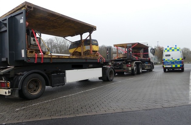 Der Lastzug mit Spezialaufbauten zur Beförderung von Abrollplattformen war den Beamten aufgefallen, weil ineinander gestapelte Tiefbaukonstruktionen mit mehreren Baumaschinen und Baggerlöffeln geladen waren. Diese waren zwar mit Spanngurten und Zurrketten gesichert, bei näherem Hinsehen stellten die Beamten jedoch eine erhebliche Gefahr für die Verkehrssicherheit fest.