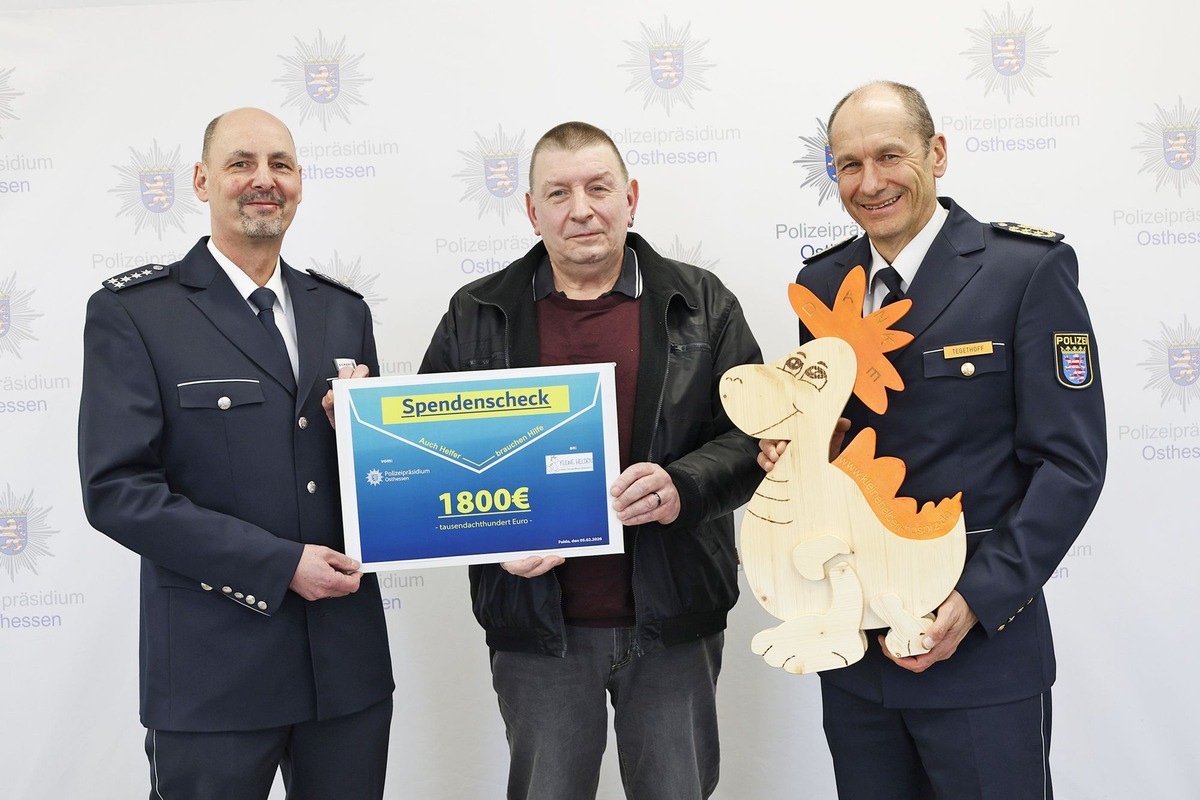 Fulda. Gemeinschaft, Besinnlichkeit und soziales Engagement standen im Mittelpunkt der traditionellen Adventsandacht mit anschließendem Weihnachtsmarkt der Belegschaft des Polizeipräsidiums Osthessen. Dabei kam eine Spendensumme in Höhe von insgesamt 1.800 Euro zusammen, die einem guten Zweck zugutekommt. Polizeipräsident Michael Tegethoff übergab die Spende nun an die "Kleine Helden Osthessen e.V." aus Hünfeld. In vorweihnachtlicher Atmosphäre kamen die Mitarbeiterinnen und Mitarbeiter des Polizeipräsidiums in der Adventszeit zusammen. Begleitet von weihnachtlicher Musik des Polizeichors Fulda und dem Landespolizeiorchester bot sich Raum für Begegnung, Gespräche und Austausch. Neben den aktiven Kolleginnen und Kollegen nahmen auch zahlreiche Pensionärinnen und Pensionäre an der Veranstaltung teil und nutzten die Gelegenheit, alte Kontakte zu pflegen. Angeboten wurden selbst gebackene Kuchen, Crêpes, Bratwürstchen sowie heiße Getränke. Der Gesamterlös ermöglichte die Spendensumme. Bei der Übergabe der Spende am Donnerstag (05.02.) betonte Polizeipräsident Tegethoff: "Wir freuen uns sehr, die Arbeit des Vereins "Kleine Helden" mit unterstützen zu können. Ihr Einsatz für Kinder und Familien in schwierigen Lebenslagen verdient höchsten Respekt. Diese Spende ist ein Zeichen unserer Wertschätzung und Solidarität." Auch den Organisatoren und Teilnehmern der Adventsandacht und des Weihnachtsmarktes sprach der Polizeipräsident seinen Dank aus: "Dank des großen Engagements, der Kreativität und des Zusammenhalts unserer Kolleginnen und Kollegen konnten wir nicht nur schöne gemeinsame Stunden verbringen, sondern auch eine beachtliche Spendensumme für einen wichtigen Zweck sammeln." Herr Schneider vom Verein "Kleine Helden", bedankte sich herzlich für die Unterstützung und betonte, dass die Spende dort ankommt, wo sie dringend gebraucht wird: bei den Kindern und ihren Familien.