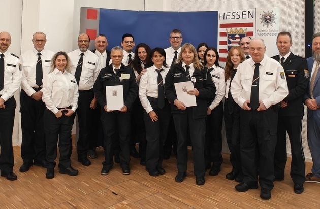 (cb) Zwölf Neuzugänge des Freiwilligen Polizeidienst (FPolD) bedeuten eine Verstärkung für die Sicherheit in mehreren Kommunen im Zuständigkeitsbereich des Polizeipräsidiums Südosthessen. Am Freitagabend begrüßte Erster Kriminalhauptkommissar Marc Sachs, Leiter des Stabsbereich 4 - Prävention die Neuzugänge sowie die zahlreich erschienen Gäste in den Räumlichkeiten des Präsidialgebäudes. Im Anschluss wurden sechs Frauen sowie sechs Männer im feierlichen Rahmen durch den Leiter der Führungsgruppe der Polizeidirektion Offenbach, Kriminaldirektor Christian Resch sowie dem Koordinator für den Freiwilligen Polizeidienst im Polizeipräsidium Südosthessen, Polizeihauptkommissar Walter Füssel, offiziell in den Dienst gestellt.