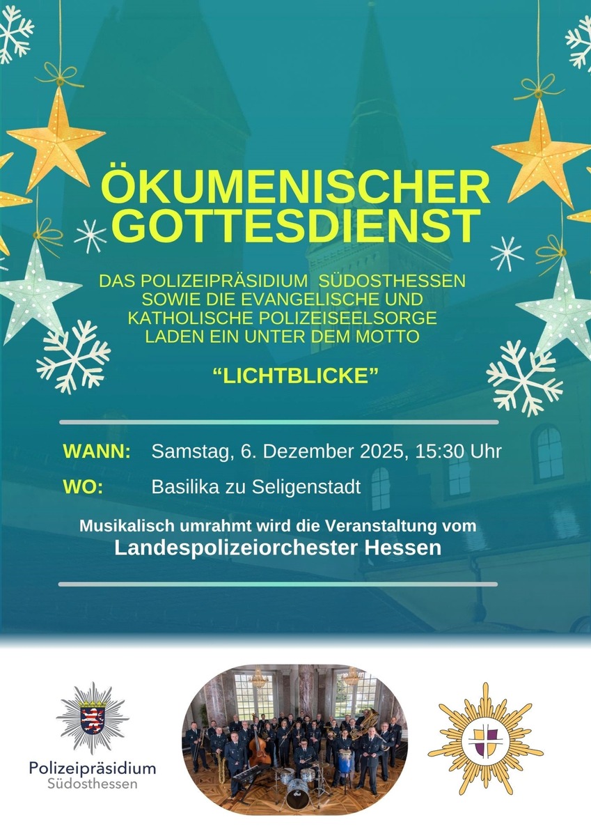 (kk) Das Landespolizeiorchester Hessen spielt in der Basilika zu Seligenstadt und wird den vorweihnachtlichen Ökumenischen Gottesdienst des Polizeipräsidiums Südosthessen untermalen.