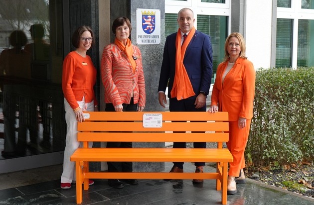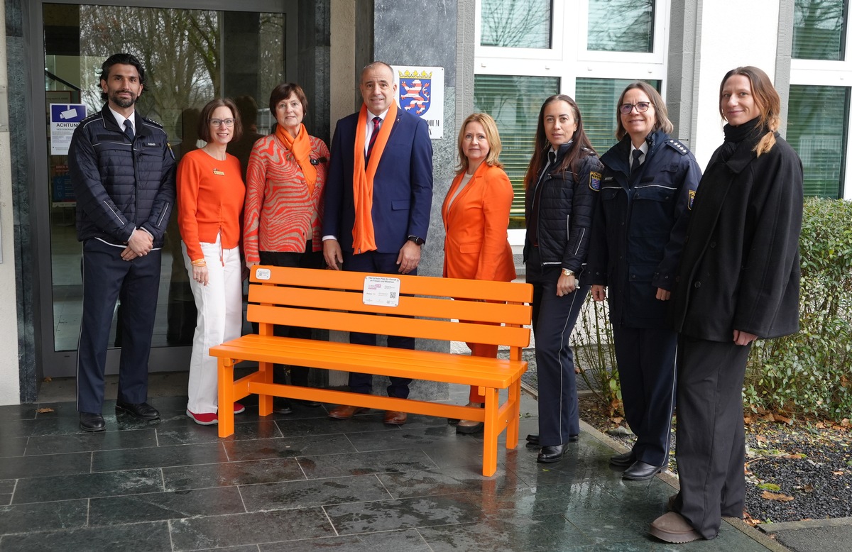 Am Freitag, dem 05. Dezember enthüllten Polizeipräsident Björn Gutzeit, Polizeivizepräsidentin Katrin Thaler, zusammen mit der Präsidentin des Zonta Clubs Wiesbaden, Frau Engel, sowie der stellvertretenden Gebietsleiterin, Frau Riemann, vor dem Polizeipräsidium gemeinsam eine orangefarbene Bank, die ein sichtbares Zeichen gegen Gewalt an Frauen setzt und gleichzeitig über eine darauf angebrachte Plakette konkrete Hilfe über Notrufnummern und Anlaufstellen vermittelt. Unter der Planung von Polizeihauptkommissarin Stephanie Barone aus dem polizeilichen Stabsbereich Prävention, nutzten weiterhin die Gleichstellungsbeauftragte Frau Kathrin Seifert sowie Vertreterinnen und Vertreter aus dem polizeilichen Bereich der Häuslichen Gewalt die Gelegenheit, um in ihren Statements die Bedeutung der Kampagne zu unterstreichen: "Häusliche Gewalt ist nie privat - Hinschauen statt Schweigen, Täter konsequent verfolgen, Solidarität im öffentlichen Raum zeigen, Prävention durch Aufmerksamkeit". Im Mittelpunkt standen der klare Appell, Gewalt gegen Frauen konsequent entgegenzutreten, sowie der gemeinsamen Aufruf Betroffene zu schützen und gesellschaftliche Aufmerksamkeit zu stärken.