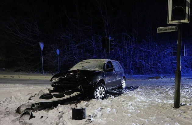 Gegen 2:15 Uhr war eine 27-jährige Ratingerin mit ihrem VW auf der Mülheimer Straße in Fahrtrichtung Breitscheid unterwegs. An der Einmündung Zum Schwarzebruch wollte sie rechts in Richtung Ratingen-Hösel abbiegen, kam aber von der verschneiten Straße ab und stieß gegen eine Ampelanlage auf einer Verkehrsinsel. Die 27-jährige Deutsche blieb glücklicherweise unverletzt, an ihrem Auto und der Ampelanlage entstand jedoch nach erster, vorläufiger Schätzung ein Sachschaden in Höhe von 18.000 Euro. Der VW war nicht mehr fahrbereit und musste abgeschleppt werden.