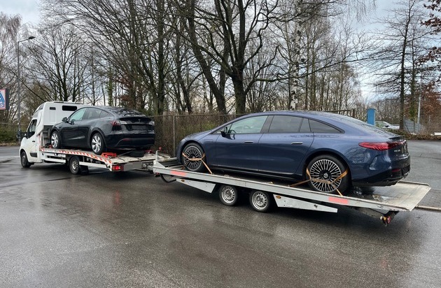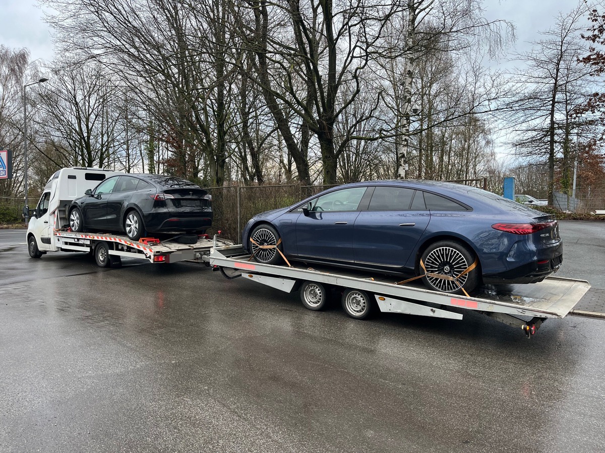 Gegen 10 Uhr stoppte der Motorradpolizist den Renault Master auf der Gräfrather Straße in Haan-Gruiten. Das Fahrzeug war mit einem Tesla beladen und zog außerdem einen Autotransportanhänger, auf dem ein Mercedes aufgeladen war. Weil der Verdacht bestand, dass der Renault massiv überladen war, wurde eine amtliche Wägung angeordnet.