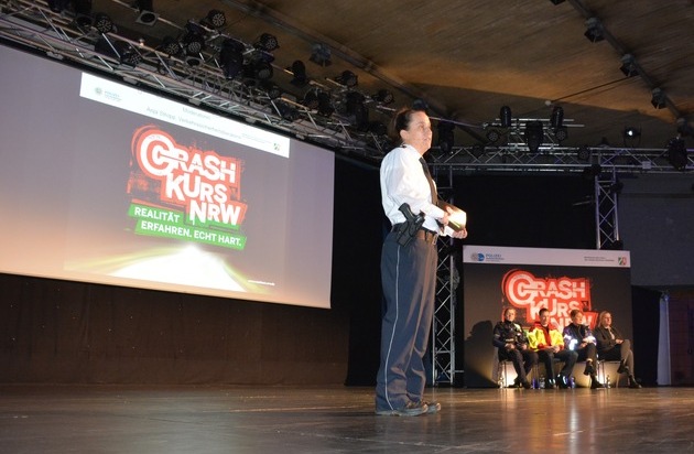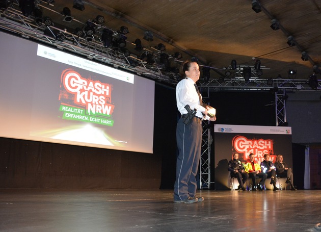 Im Unterricht werden die jungen Leute darauf vorbereitet, was sie in der Bühnenveranstaltung erwartet. Polizeibeamte, Feuerwehrleute, Rettungssanitäter, Notfallseelsorger, Angehörige und Opfer berichten darin von ihren Erfahrungen und Erlebnissen bei Unfällen, an denen junge Menschen beteiligt waren. Weitere Infos rund um "Crash Kurs NRW" gibt es im Internet unter https://polizei.nrw/artikel/realitaet-erfahren-echt-hart.