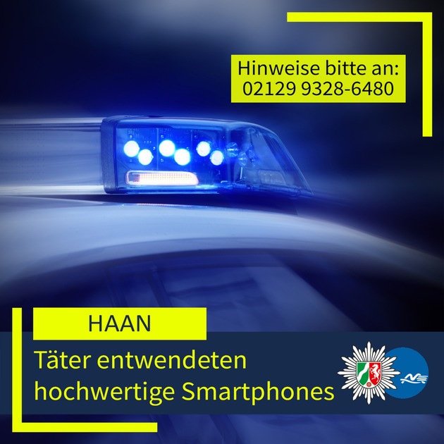 In Haan haben zwei Täter am Dienstag (17. Februar 2026) mehrere Handys aus dem Ladenlokal eines Mobilfunkanbieters entwendet. Die Polizei ermittelt und bittet um Hinweise.