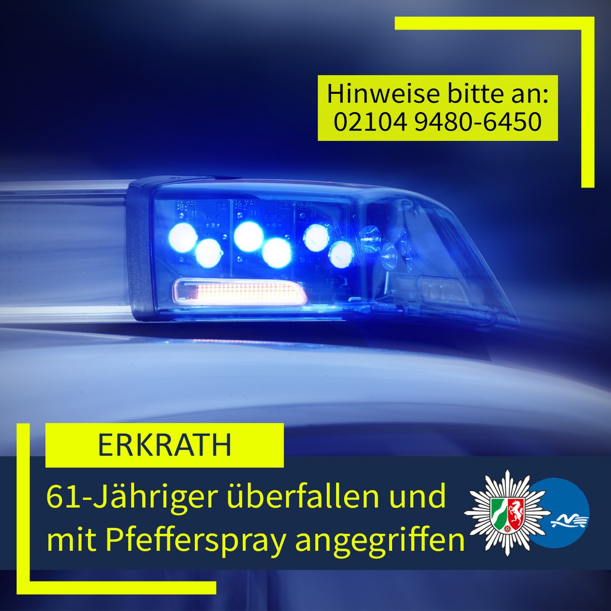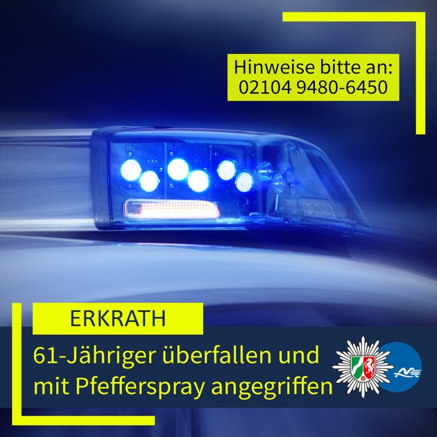 Im Erkrather Ortsteil Hochdahl haben in der Nacht auf Sonntag (8. März 2026) zwei Jugendliche einen 61 Jahre alten Mann mit Pfefferspray angegriffen und beraubt. Die Polizei ermittelt und bittet um Hinweise von Zeuginnen oder Zeugen.