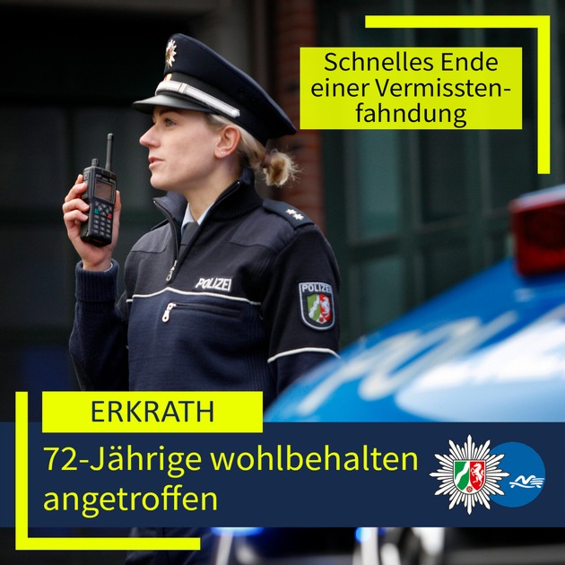Wie bereits berichtete, suchte die Polizei am Dienstag (10. März 2026) in Erkrath und Umgebung nach einer als vermisst gemeldeten 72 Jahre alten Frau.