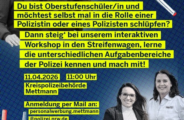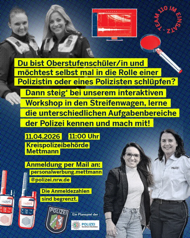 Kostenlose Anmeldung bis zum 9. April unter: personalwerbung.mettmann@polizei.nrw.de