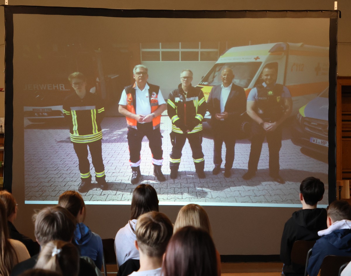 Fragen wie "Was war Ihr gefährlichster Einsatz?", "Welcher Form von Gewalt sind Polizistinnen und Polizisten am häufigsten ausgesetzt?" oder "Wie sieht der Alltag von Polizisten aus?" gehörten zu den zahlreichen, teils auch kritischen Fragen, die die Schülerinnen und Schüler an die anwesenden Polizeibeamtinnen und -beamten richteten. Ihnen wurde deutlich gemacht, dass polizeiliches Handeln stets auf Grundlage von Recht und Gesetz erfolgt mit dem Ziel, Bürgerinnen und Bürger zu schützen und Gefahren abzuwehren. Gleichzeitig bilde ein respektvoller Umgang die Grundlage für ein funktionierendes Miteinander. Dabei berichteten die Einsatzkräfte auch von Situationen, in denen sie Anfeindungen oder aggressive Verhaltensweisen erleben und wie professionell sie in solchen Fällen reagieren müssen.
