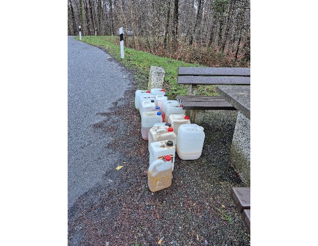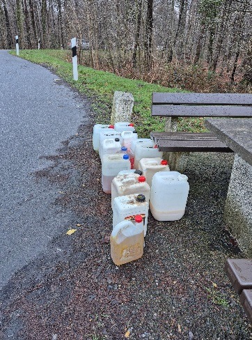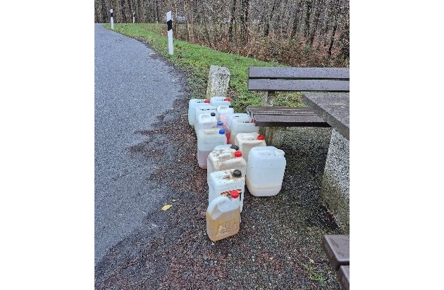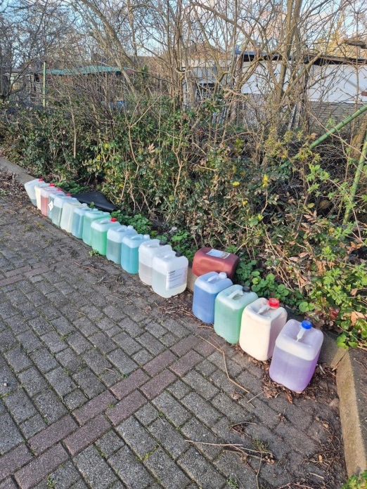 Mittwochmorgens am 25.03.26 meldete ein Verkehrsteilnehmer der Polizei, dass auf dem Parkplatz Stern in Elsdorf-Westermühlen 16 Kanister mit unterschiedlichen Flüssigkeiten stehen würden.