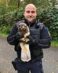 Eine Streife der Bundespolizei entdeckte einen Mäusebussard am Rande der linken Fahrbahn auf der A 23. Da der Vogel offensichtlich nicht mehr fliegen konnte, entschlossen sich die Beamten das Tier zu retten.
