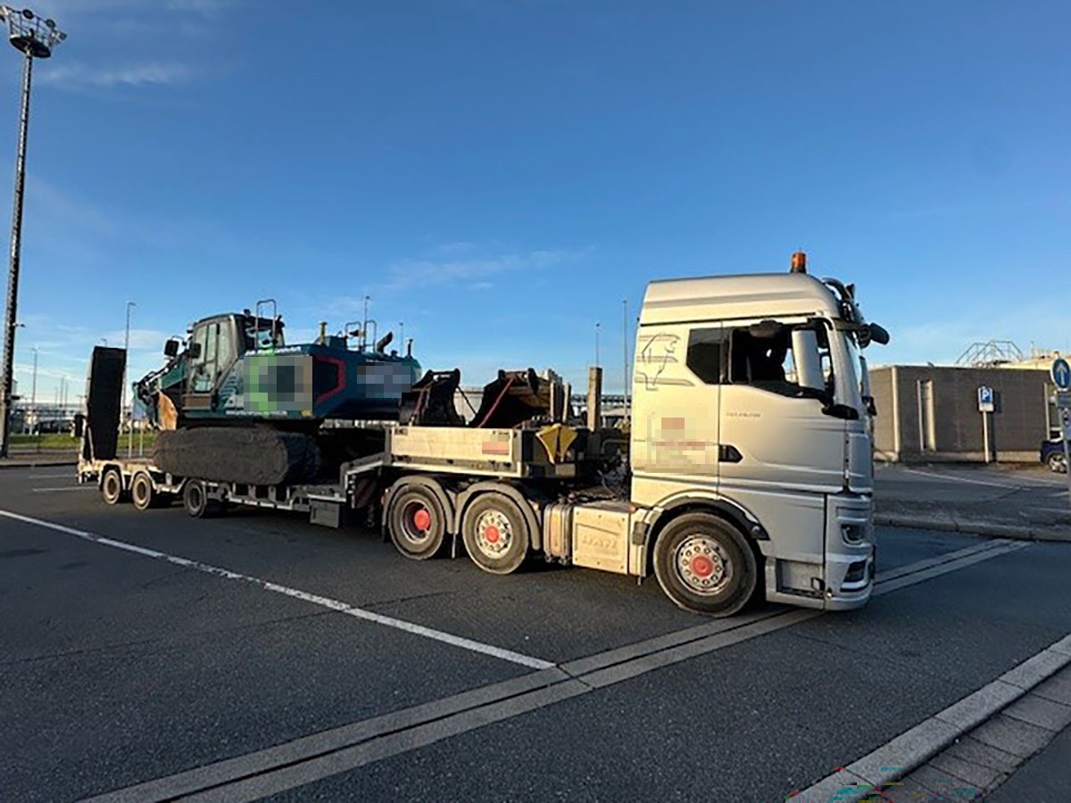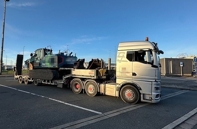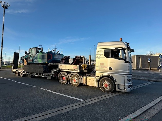 Ein etwa 7,5 Tonnen zu schwerer Sattelzug wurde durch Einsatzkräfte der Polizei Gelsenkirchen am Montag, 3. November 2025, auf der Kurt-Schumacher-Straße in Schalke-Nord gestoppt. Der Sattelzug fiel den Spezialisten der Verkehrsdienstgruppe Sonderverkehr aufgrund seiner übermäßigen Ladung, einem breiten Kettenbagger mitsamt Zubehör, auf. Der Fahrzeugführer konnte bei der Kontrolle zwar eine Ausnahmegenehmigung für Schwertransporte vorweisen, da das Gespann nach Überprüfung auf einer Waage in Nähe der Uferstraße jedoch die zulässige Gesamtmasse überschritt, erlosch diese. Der 45-jährige Fahrzeugführer wurde mit seinem Sattelzug zu einem Parkplatz an der VELTINS-Arena begleitet. Hier musste er den Bagger und das Zubehör abladen und seine Fahrt ohne Ladung fortsetzen. Ihn erwartet ein Ordnungswidrigkeitenverfahren.