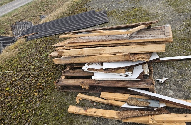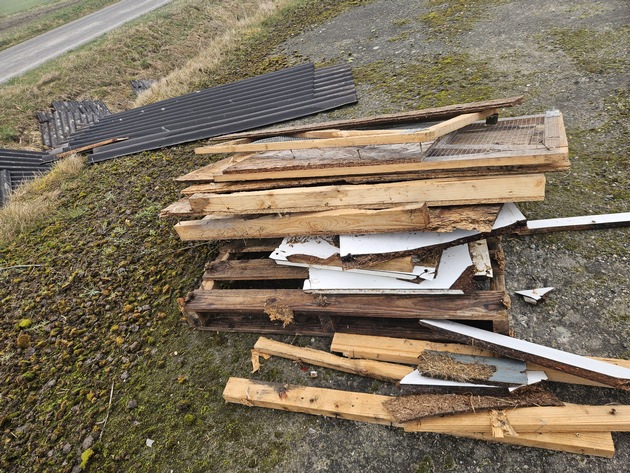 In der Zeit vom 28. Februar bis zum 14. März 2026 entsorgte der Unbekannte in der Feldmark Schülperneuensiel zahlreiche Wellplatten, Bauholz und Kaninchendraht. Nach ersten Erkenntnissen dürfte es sich dabei um Abfälle handeln, die beim Abriss eines Kleintierstalls angefallen sind.