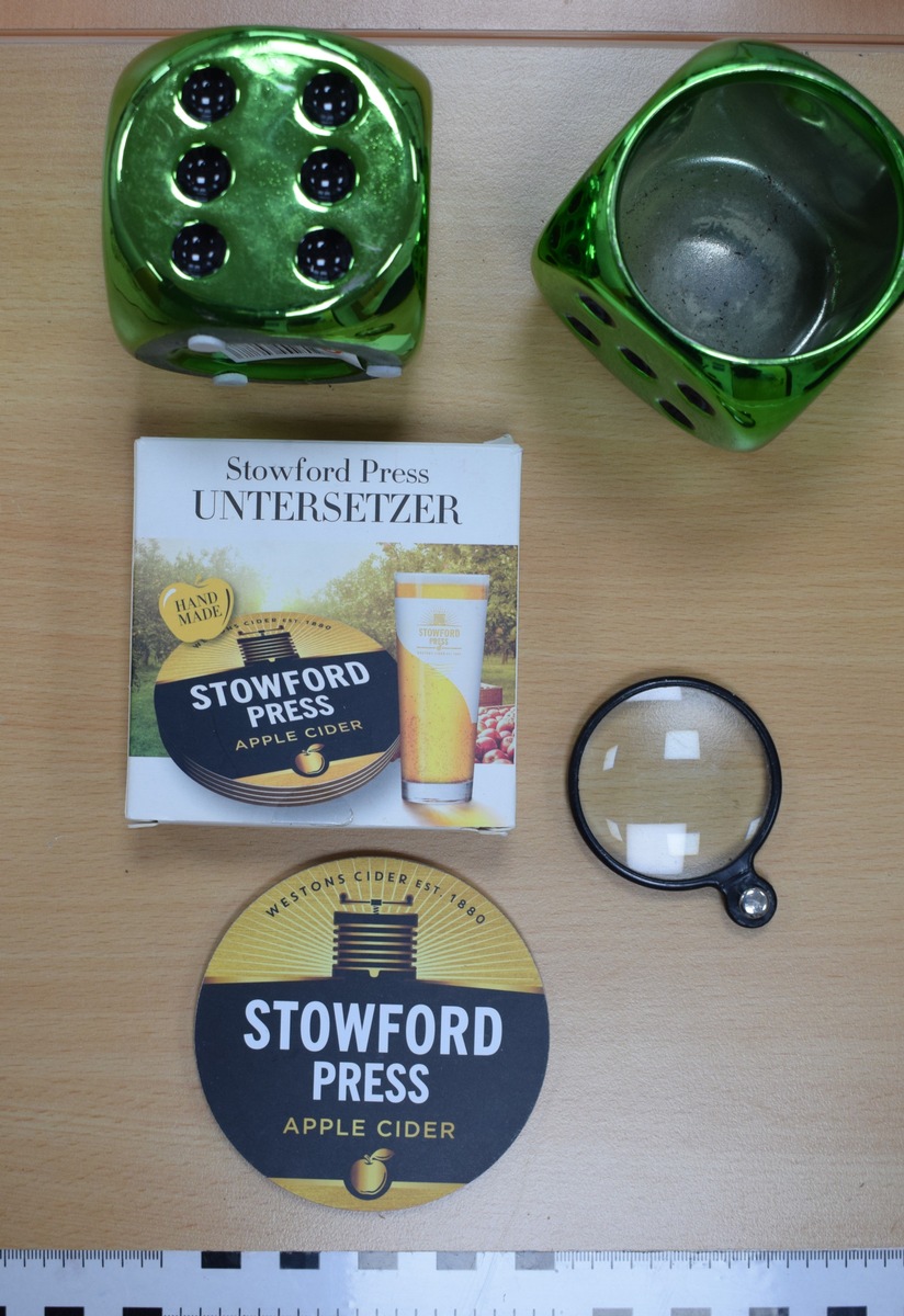Es handelt sich um mehrere Ohrringe, Ringe und Ketten. Hinzu kommen eine Dose in Würfeloptik, eine Packung Getränkeuntersetzer und eine Lupe.