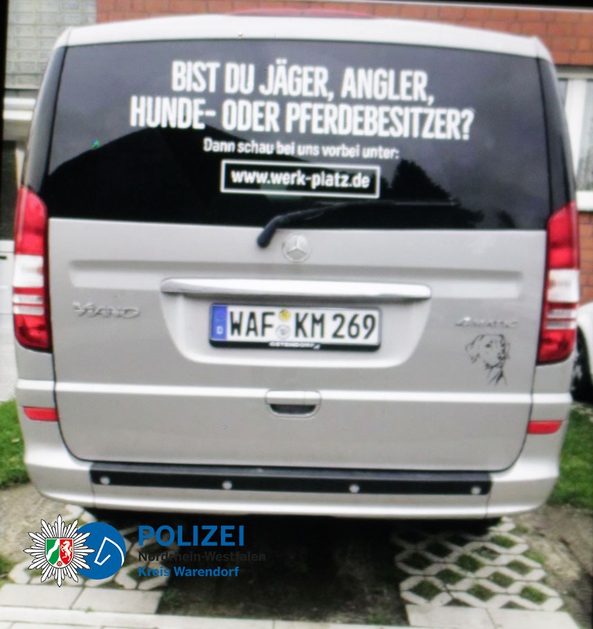 In der Zeit vom Montag (05.01.2026) 23.45 Uhr bis Dienstag (06.01.2026) 5.10 Uhr wurde in Ahlen an der Schumannstraße ein silberner Mercedes Vito entwendet. Die hinteren Scheiben des Fahrzeugs sind schwarz foliert und am Heck und an der linken Seite befindet sich auf der Scheibe ein weißer Werbeaufdruck "Werkplatz". Am Fahrzeug befinden sich die Kennzeichen WAF-KM269. Hinweise zum Diebstahl oder Verbleib des Pkw bitte an die Polizei in Ahlen, Telefon 02382/965-0 oder per E-Mail: poststelle.warendorf@polizei.nrw.de.
