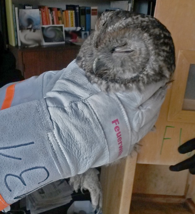 Vermutlich bereits in der vergangenen Nacht ist ein Kauz in den Kamin eines Einfamilienhauses in Essen-Heisingen geplumpst. Als die Hausherrin heute früh in ihr Wohnzimmer kam, schaute sie der Vogel mit großen Augen aus dem mit einer Scheibe verschlossenen Kaminofen ganz ruhig an. "So ein Tier ist ja nicht klein, alleine hätte ich es sicher nicht aus dem Ofen befreien können", sagte die Dame. Mehrere Telefonate mit verschiedenen Institutionen lösten ihr Problem nicht, bis das Wörtchen "Feuerwehr" fiel. "Nachdem ich per Notruf mein Problem geschildert hatte, standen kurz darauf drei Feuerwehrmänner mit dicken Handschuhen und einer Holzkiste in meinem Wohnzimmer", berichtete die Dame. Behutsam holten die Männer den Vogel aus dem Ofen und setzten ihn in das mitgebrachte Behältnis. Der Kauz ließ alles widerstandslos über sich ergehen. Da er augenscheinlich unverletzt war, gingen die Retter mit dem Vogel in ein nahegelegenes Wäldchen, öffneten die Kiste, und kurz darauf flog der Vogel auf und verschwand in den Bäumen. (MF)