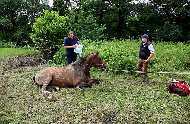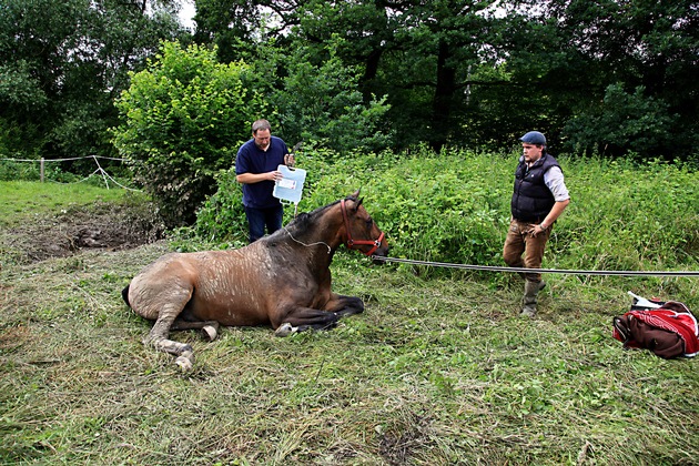 Ein 18 Jahre alter, rund 600 Kilogramm schwerer Wallach hat heute Vormittag (21.06.2016) in Essen Byfang verbotenes Terrain betreten. "Laptop" (Anm: Name des Tieres) hatte sich auf ein von seiner Weide abgeteiltes Gelände begeben und war dort in einen im Graben fließenden Bachlauf gerutscht. Als die Stallmeisterin des Reitervereins mittags die Tiere in den Stall holen wollte, bemerkte sie das Desaster. Sofort alarmierte sie die Feuerwehr und weitere ehrenamtliche Helfer. Bei Eintreffen der ersten Einsatzkräfte war klar, dass das eine anspruchsvolle Tierrettung werden würde. Die Zugänglichkeit zur Unglücksstelle führte über eine morastige, knöcheltiefe Wiese, eine Anfahrt mit schweren Fahrzeugen war unmöglich. An der gegenüberliegenden Seite stand zwar ein Radlader, wegen der Hanglage schied auch er als Hilfsmittel aus. Zu groß das Risiko, dass er unter Last vornüber kippen könnte. So entschied sich der Einsatzleiter für den Einsatz der hydraulischen Seilwinde des Feuerwehrkranes. Das Seil wurde so weit wie möglich abgerollt und mit zwei zusätzlichen Drahtseilen auf die richtige Länge gebracht. Der zwischenzeitlich eingetroffene Tierarzt gab dem Unglücksraben Beruhigungsmittel, und dann führten Feuerwehrleute und Arzt eine Schlinge unter dem Tier hindurch. Keine leichte Aufgabe im Morast und fließenden Wasser. Mehrere Ansätze und viel Fingerspitzengefühl beim Bedienen der Seilwinde waren nötig, bis Laptop nach knapp zwei Stunden schließlich auf festem, ebenen Boden lag. Der Tierarzt verabreichte kreislaufstabilisierende Mittel, eine Infusion tat ihr Übriges. Nach etwa einer Stunde wachte Laptop langsam auf, und seither versuchte er bereits mehrfach, auf die Beine zu kommen. Nach aktuellen Informationen (21.06.2016, 17.30 Uhr) ist das jedoch noch nicht gelungen, die Situation hat das Tier wohl sehr stark belastet. (MF)