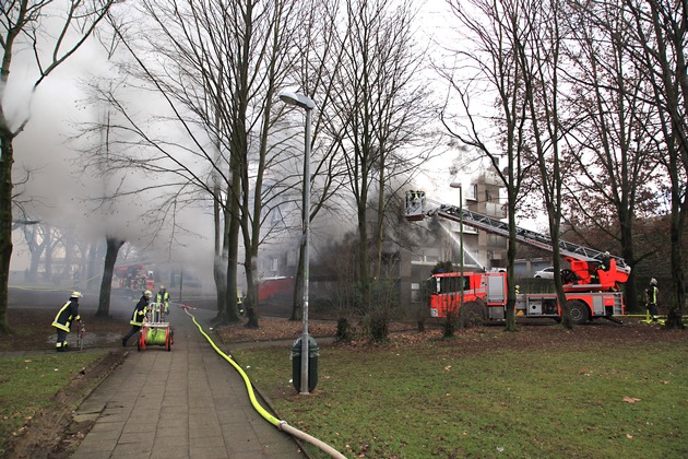 Am Mittag ist in Essen-Altendorf an der Heinitzstraße im zweiten Obergeschoss eines Mehrfamilienhauses mit zwölf Parteien ein Feuer ausgebrochen. Durch den sehr intensiven Brand breitete sich das Feuer über durchgebrannte Fenster in die darüber liegende Wohnung aus. Um ein Haar wäre auch ein Fenster einer Wohnung im vierten Obergeschoss geborsten. Bereits auf der Anfahrt bekamen die Einsatzkräfte die Information, dass in der Brandwohnung zwei Personen am Fenster stünden und zu springen drohten. Die ersteintreffenden Kräfte der Feuerwache Borbeck brachten zunächst ein Sprungpolster in Stellung, retteten die beiden jungen Männer (22 und 27 Jahre alt) jedoch mit der Drehleiter. Weitere Personen konnten unter Fluchthauben durch den Treppenraum in Sicherheit gebracht werden. Parallel zur Brandbekämpfung mit mehreren Rohren im Innen- und Außenangriff betreute ein Trupp im vierten Geschoss eine junge Frau (28) und ihre beiden Kinder (3 Jahre und 8 Monate) in ihrer rauchfreien Wohnung. Erst als der Treppenraum mittels Hochdrucklüfter rauchfrei geblasen war, wurden sie ins Freie geleitet und vom Notarzt untersucht. Insgesamt retteten die Feuerwehrleute sieben Erwachsene und zwei Kinder, nach ärztlicher Untersuchung war klar, dass niemand verletzt war. Nach Belüftungsmaßnahmen und Schadstoffmessungen konnten neun der insgesamt zwölf Wohneinheiten wieder freigegeben werden. Die Feuerwehr war mit 50 Einsatzkräften vor Ort, die Heinitzstraße war für rund eine Stunde komplett gesperrt, die Straßenbahnen der Linie 101 steckten fest. (MF)