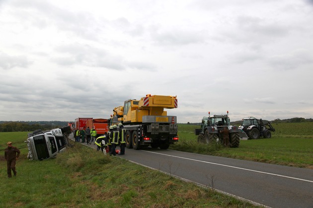 FW-E: Sattelzug kommt von Fahrbahn ab und kippt auf Acker, 25 Tonnen Rüben rollen aus dem Auflieger