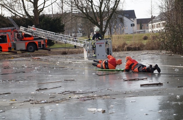 Dazu wurde ein Kollege der Feuerwache Altenessen mit einem Wasserüberlebensanzug "präpariert", welcher dann einen leichtsinnigen Mitbürger nachahmte. Nun begab sich dieser Proband, verbotener Weise, auf die Eisfläche des Teiches und brach erwartungsgemäß ein. Nun lief die eigentliche Übung an und die Kollegen der Feuerwehr Essen nahmen unterschiedlichste technische Geräte zur Rettung vor. Neben dem Eigenschutz der eigenen Kräfte stand die schnelle und patientenorientierte Rettung im Vordergrund. Aufgrund der optimalen örtlichen Gegebenheiten konnte sogar eine Rettung über eine Drehleiter im sogenannten Niederflurbetrieb geübt werden. Am Ende der Übung stand auch für die inzwischen zahlreich zusehenden Passanten fest, dass es lebensgefährlich ist sich auf eine nicht freigegebene und nicht tragfähige Eisfläche zu begeben. In diesem Zusammenhang wäre zu erwähnen, dass Verbotsschilder häufig missachtet werden, obwohl eine Eisfläche aufgrund von Strömungen und anderen Faktoren hinsichtlich der Tragfähigkeit von Laien nicht einzuschätzen ist. Einen zusätzlichen nützlichen Nebeneffekt zur eigentlichen Übung gab es auch noch. Die Eisrettungsgeräte (Bohlen und Stangen) für Laienhelfer, die in Ufernähe des Teiches im "Kaisergarten" für die Menschenrettung gelagert werden, waren zuvor von Unbekannten einfach auf die Eisfläche geworfen worden. Diese Rettungsgeräte wurden durch die Feuerwehr wieder an ihren vorbestimmten Platz verbracht. Dieser schlechte Scherz kann durchaus in einer Notfallsituation Menschen das Leben kosten. (S.J./B.W.)