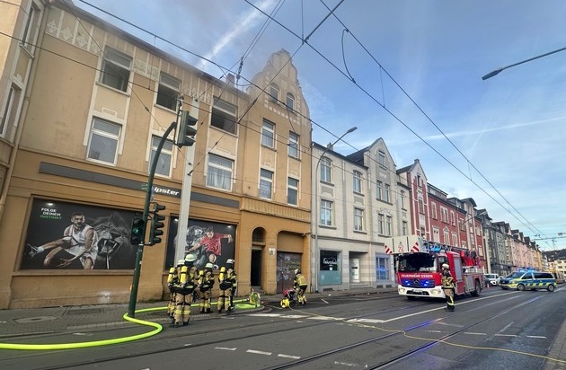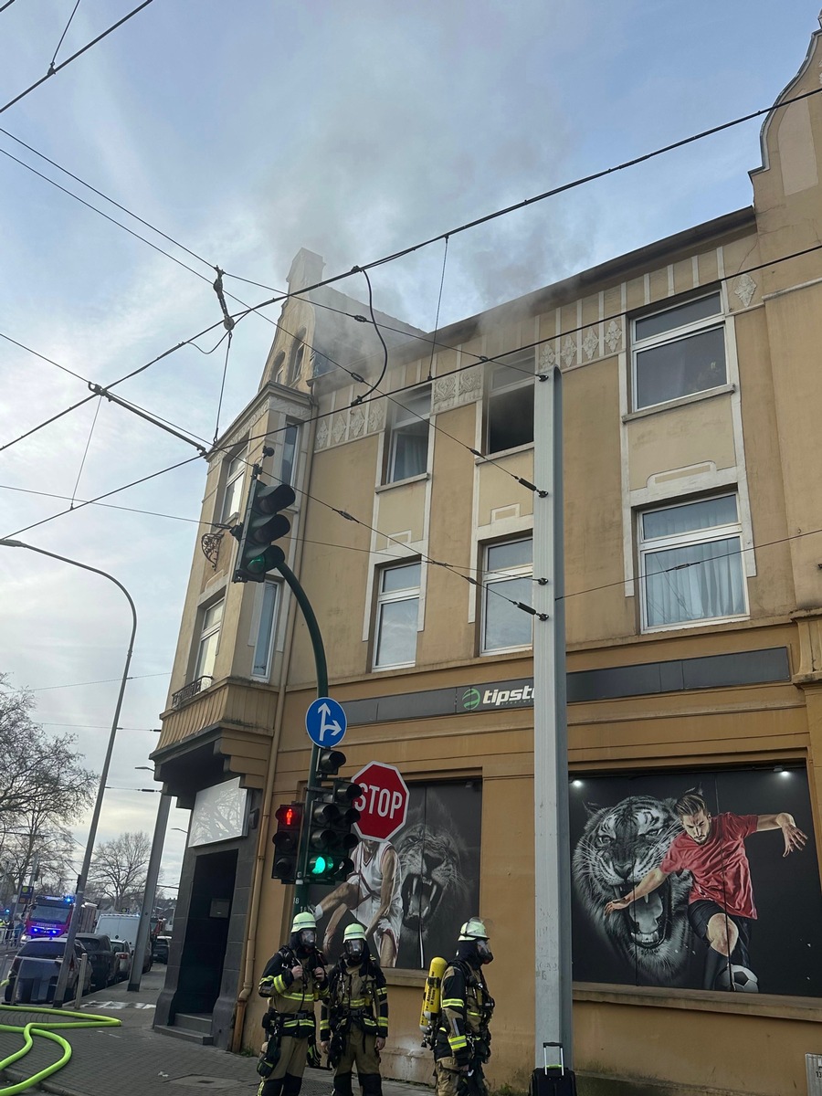 Umgehend entsandte die Leitstelle zwei Löschzüge der Berufsfeuerwehr sowie die Freiwillige Feuerwehr Essen-Katernberg zur Einsatzadresse. Vor Ort bestätigte sich die gemeldete Lage: Aus einem Fenster im 2. Obergeschoss drang sichtbar Rauch.